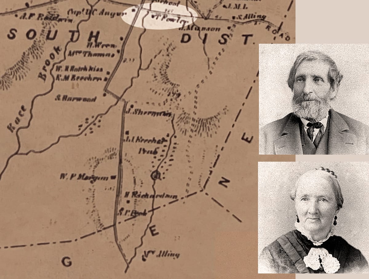 A prior owner of this home, according to the caption under the photo of the house in the 1911 publication, was Timothy Fowler III (1814-1888) and his wife Mary Eliza Stevens (1818-1885). The location of their home is marked on the 1868 Beers map of Woodbridge just east of a waterway that crosses Ansonia Road near the corner of Johnson Road (see highlighted area, marked T. Fowler).