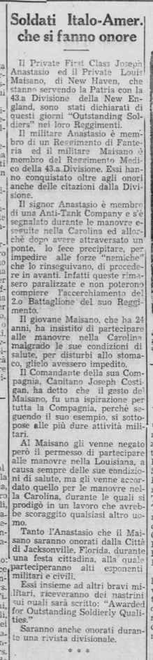 In 1942, the paper praised him in “Soldati Italo-Americani che si fanno onore” (Italian-American Soldiers Who Bring Honor), citing his leadership during training maneuvers in North Carolina.