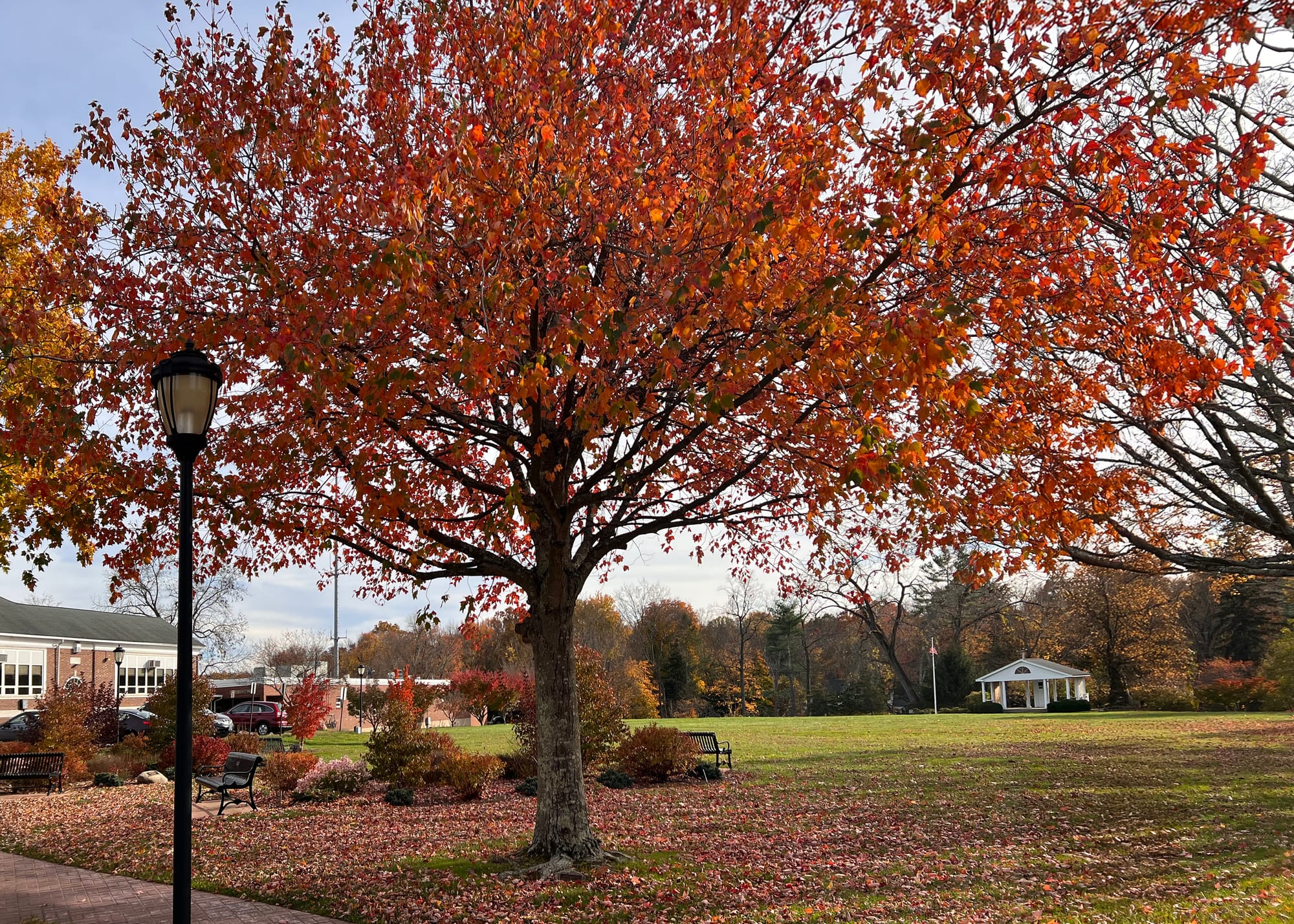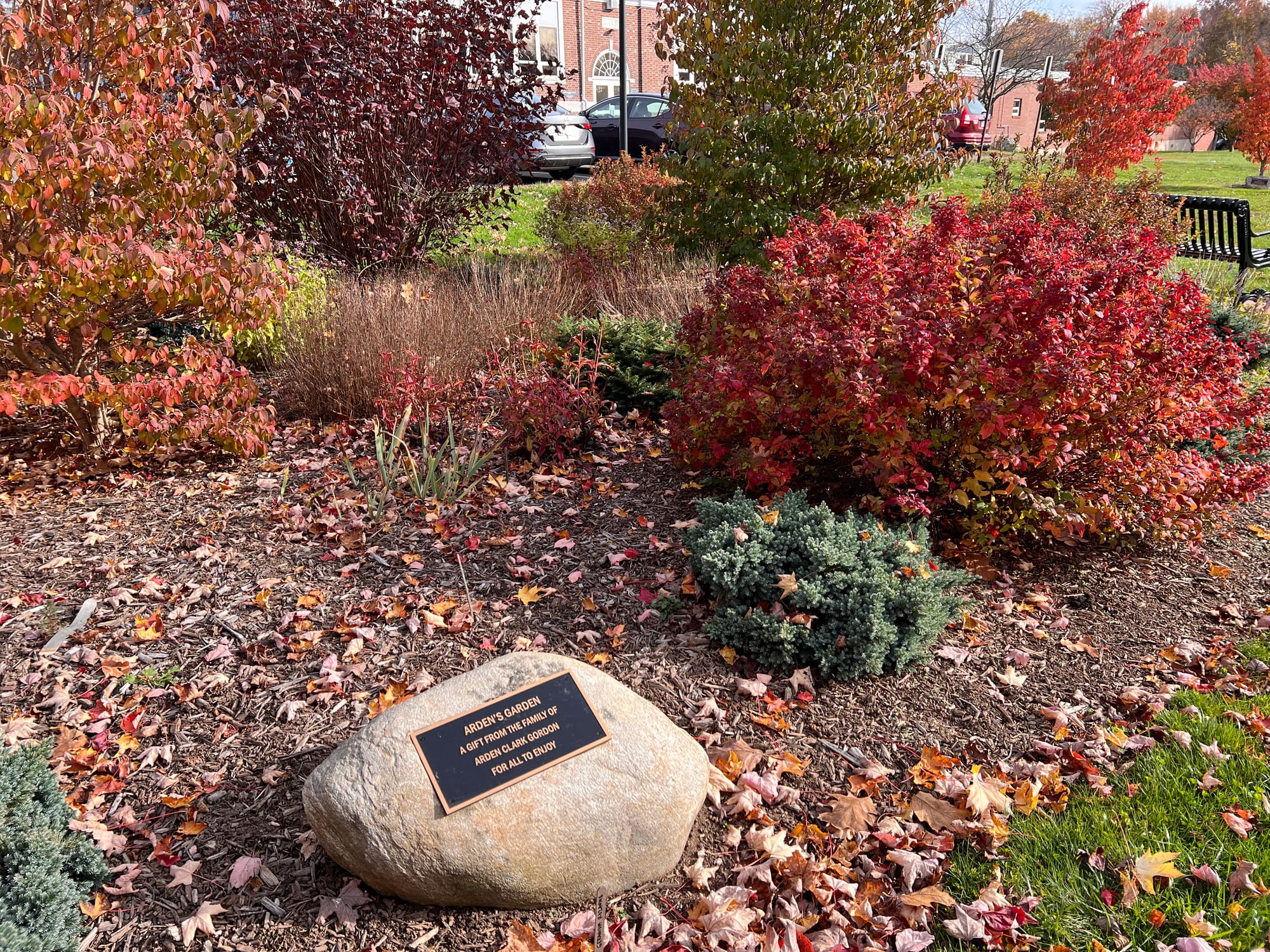 Side by side at the entrance to the Woodbridge Green a tree is dedicated to Ted Clark and a garden dedicated to his daughter Arden Clark Gordon. with the gazebo in the distance.