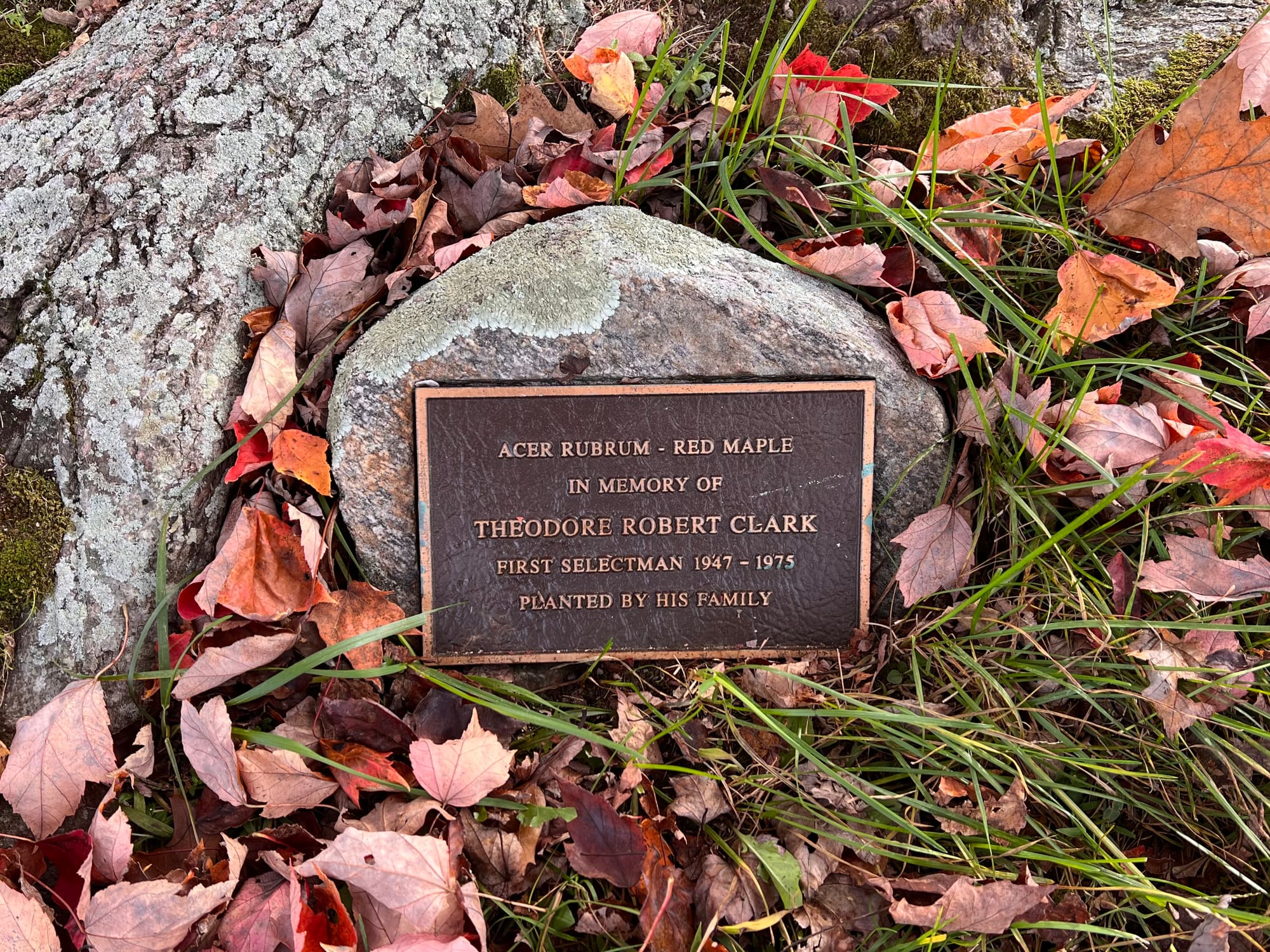 Today, traces of both men’s contributions can still be found in the center of town. Just outside Town Hall, near the site of the old meetings Ted Clark once presided over, stands a tree planted in his memory — its bronze plaque weathered but still legible after half a century.