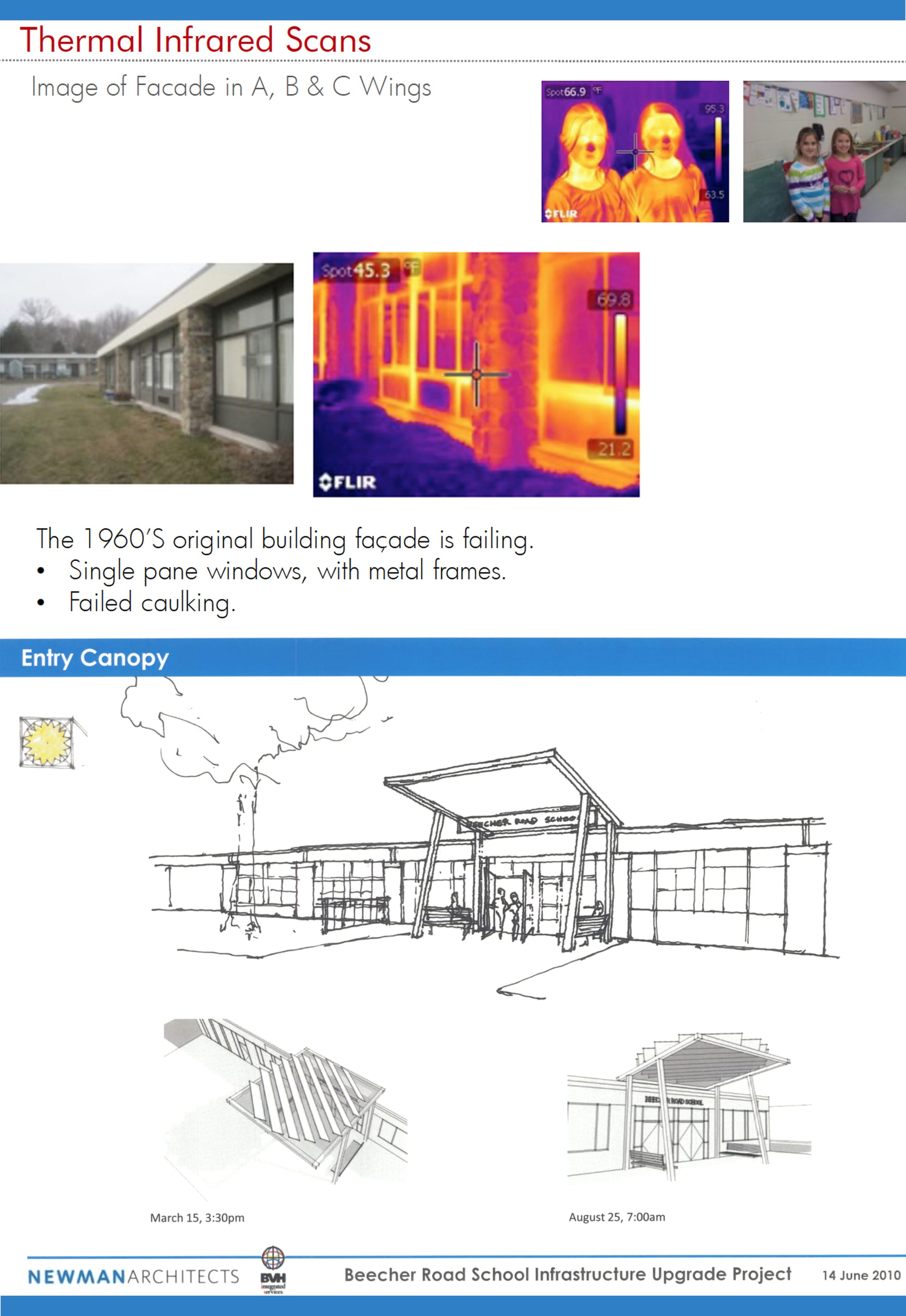 Some examples from the planning process include a thermal scan that shows energy pouring out the windows the project would replace, as well as sketches from architect Herb Newman for a more welcoming entrance with a new canopy.