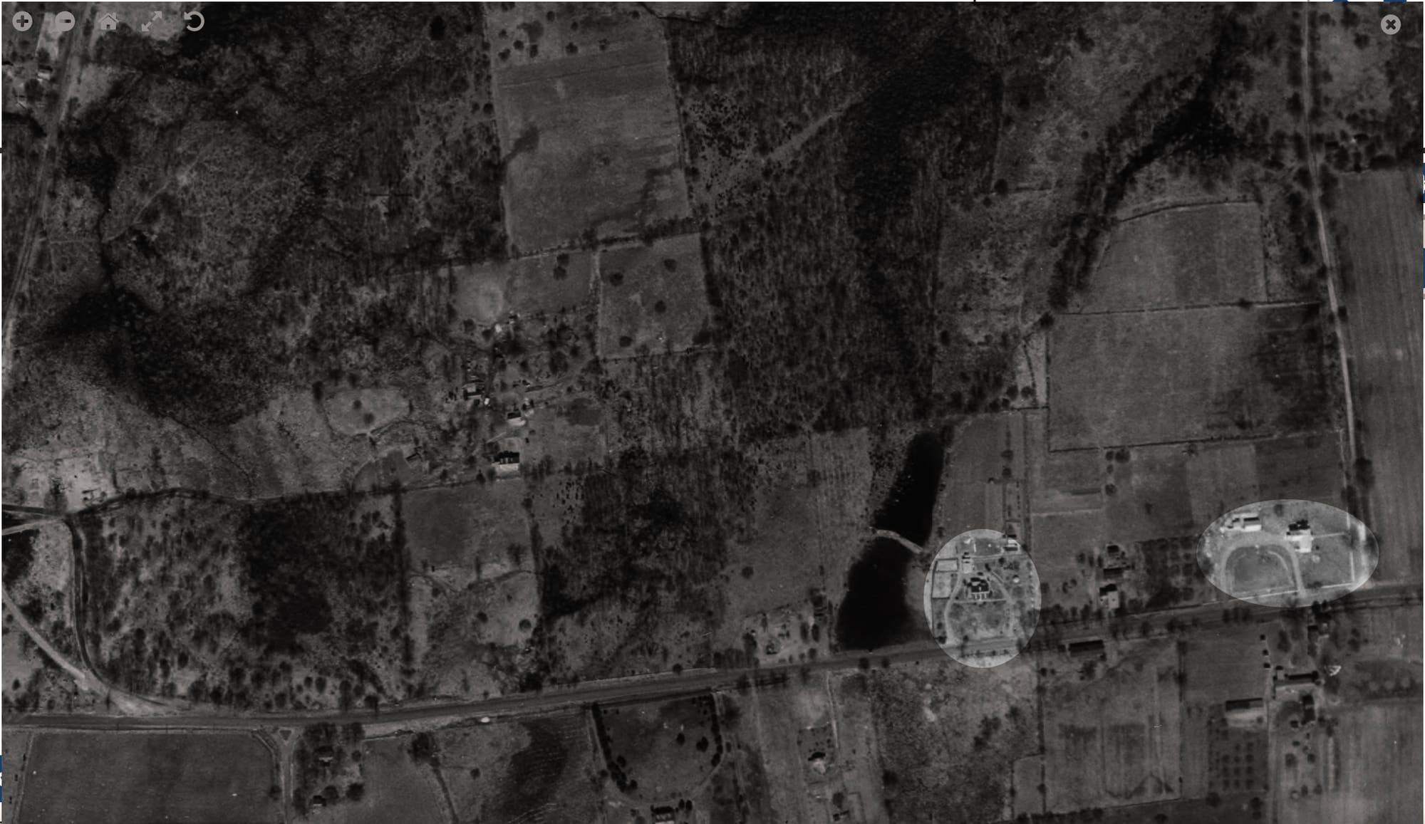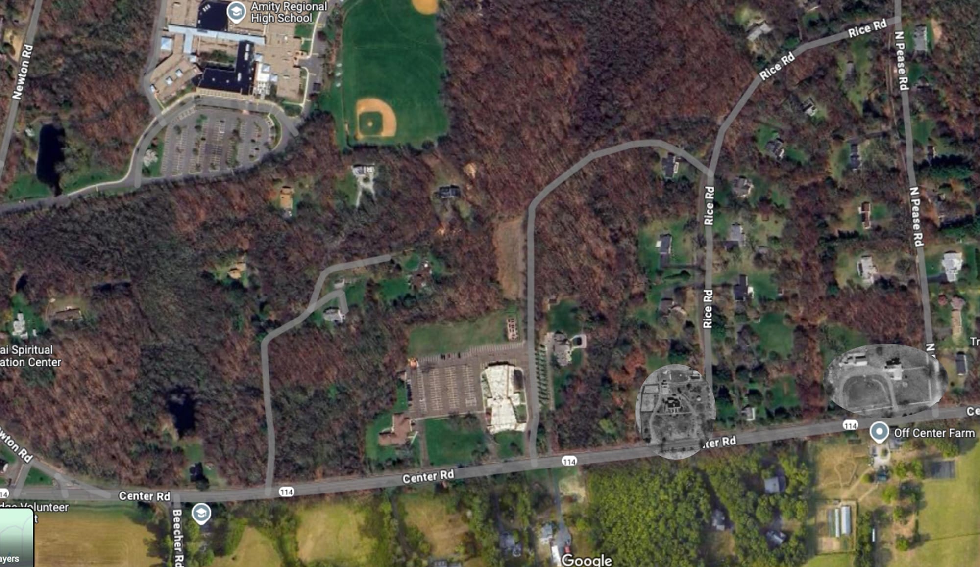 The 1934 aerial map of Woodbridge with the Rice and Razee houses circled; today's view from Google maps, with both 1934 house images inset.