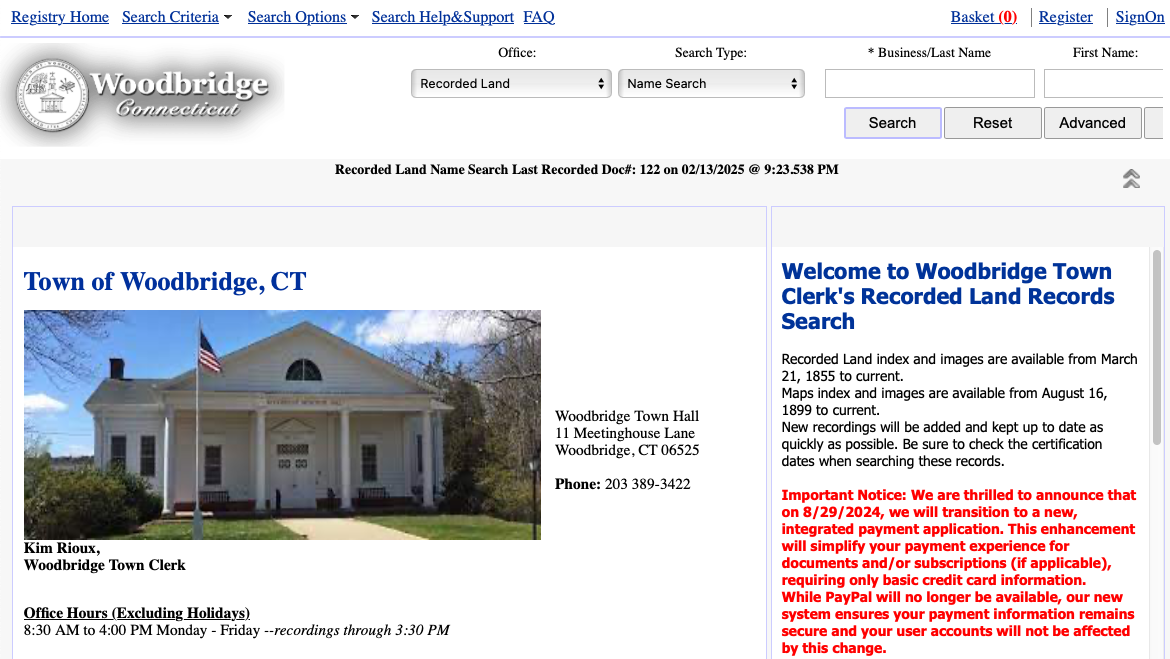 To access Woodbridge Land Records online visit the U.S. Land Records online resource. Once there, select Connecticut from the list of states, choose Woodbridge from the list of towns, and follow the provided directions to search for land records by name, property address, or date. This tool offers a convenient way to examine historical deeds, property transfers, and other land-related documents essential for understanding the development and history of Woodbridge, CT.