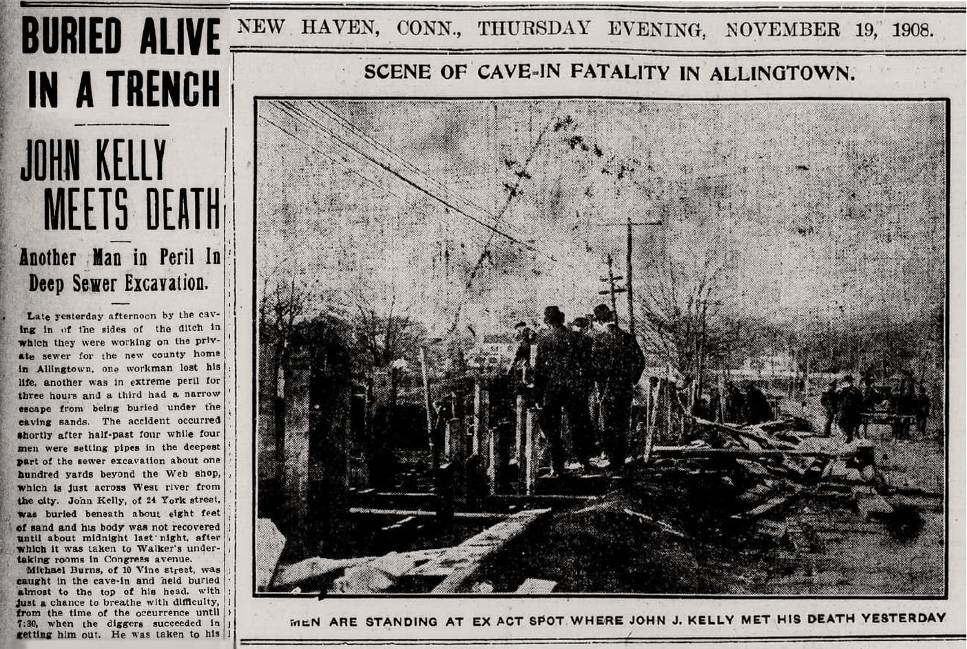 Later that same day, at 4:30 pm on the roads of West Haven's Allingtown, 35 year-old John J. Kelly is killed in a cave-in of a sewer trench in which he is working. It takes rescuers three hours to dig out Michael Burns who is trapped with him and “held buried almost to the top of his head with just a chance to breathe with difficulty.”