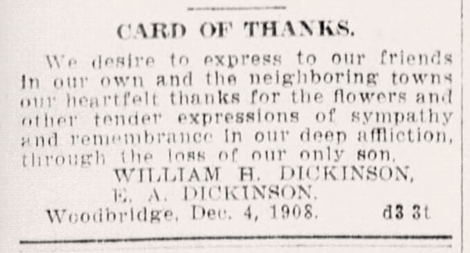 On the same day that John J. Kelly is interred in St. Bernard's cemetery, another set of friends and family are gathered in Woodbridge to mourn the passing — all too soon — of Henry Thomas Dickinson (1887-1908) as he is laid to rest in Eastside Cemetery.