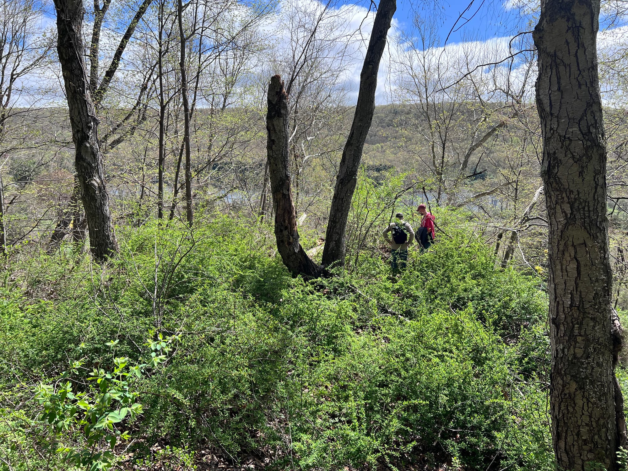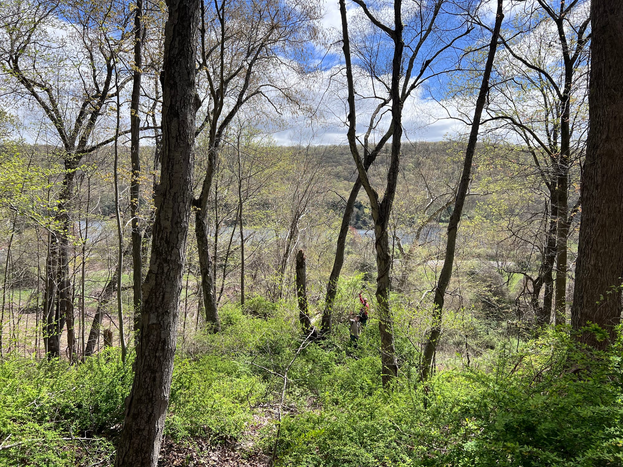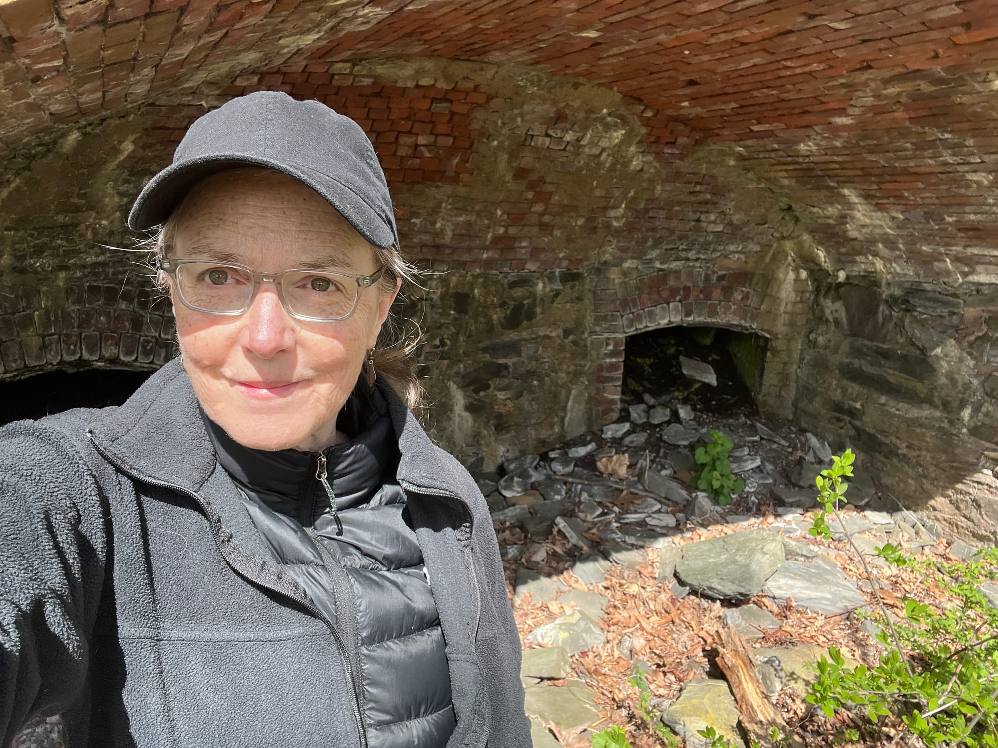 Today, taking part in Earth Day weekend activities in Woodbridge, a small group of us set out to visit the old kiln site. Gathered at the nearby Darling House and hiking up the Blue Trail through Camp Whiting, we came upon the ruins of the kiln and the adjoining pit where raw earth materials were dug out and transported down the embankment to the kiln itself for processing. Quiet now, and overgrown with trees and vines, the site merely hints at the bustle of activity that surrounded it in the 1870s.