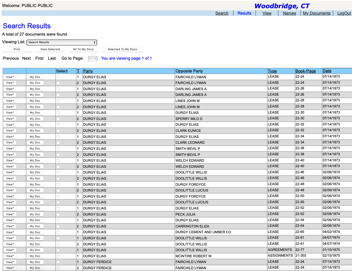 Woodbridge land records showing the transactions Fordyce Durgy entered into from 1873-1878.