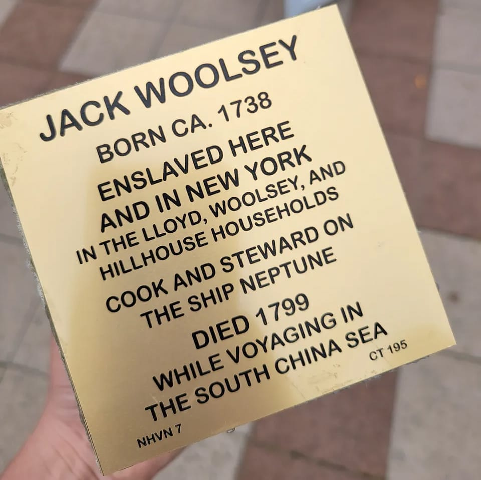 Jack Woolsey's full Witness Stone Project story can be read at the organization's website, where he is honored as CT marker #195. And what was his connection to the Hillhouse household in the greater New Haven area? For more clues about Jack's life, we can look for him in the recently published 'Yale and Slavery - A History,' a comprehensive accounting of the ties to enslavement that the university's archives illuminate. Indeed, Jack Woolsey appears on pages 104 and 105: