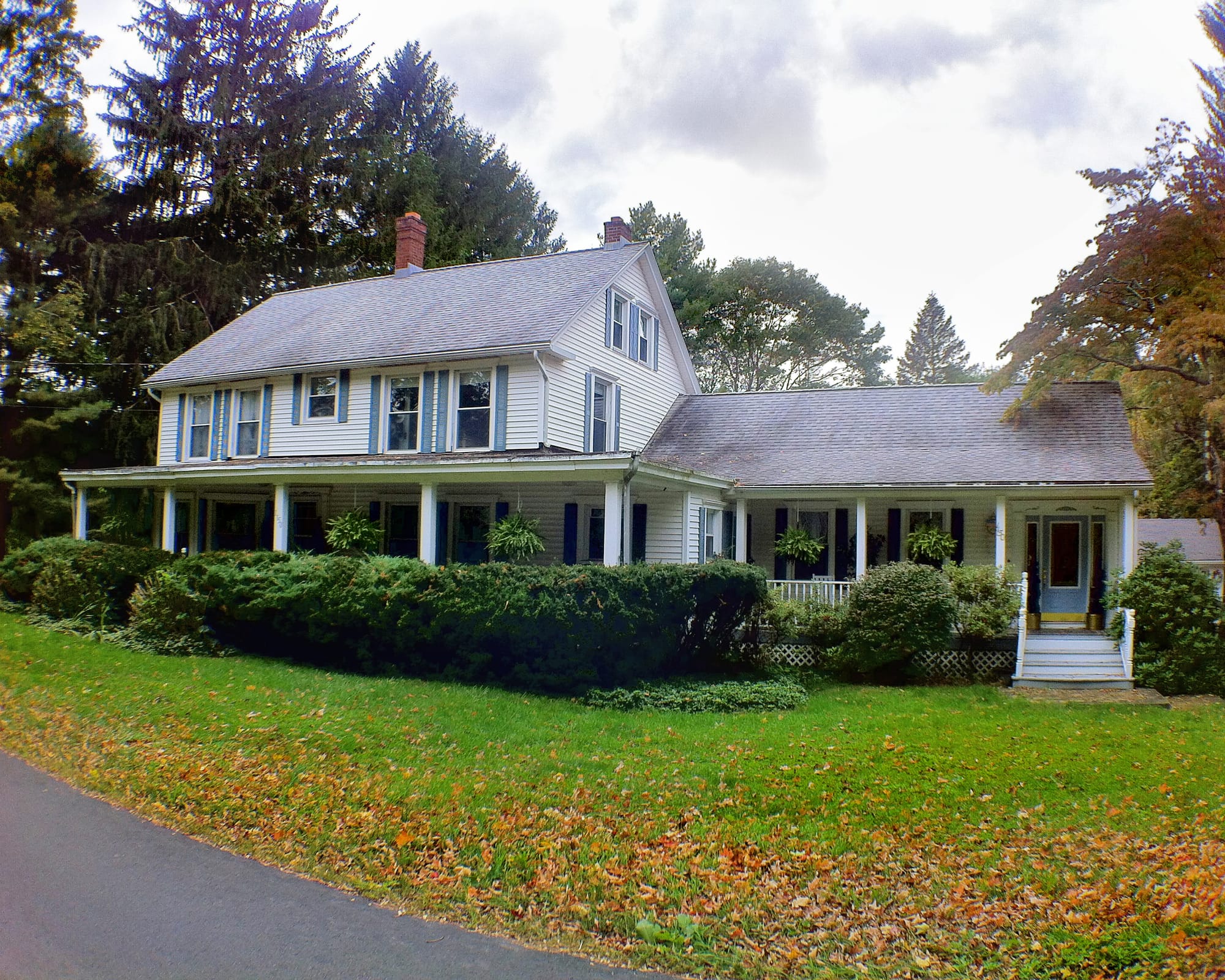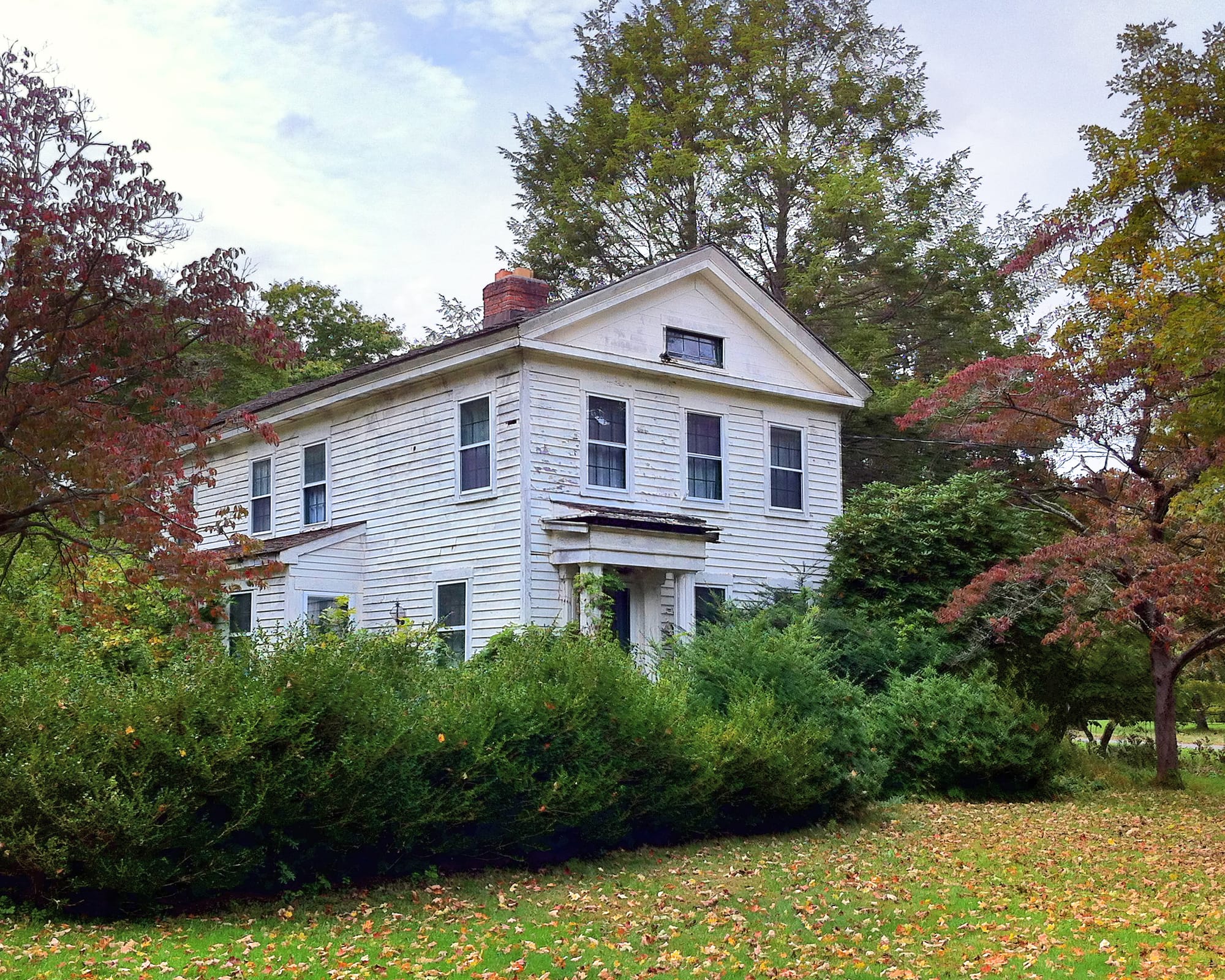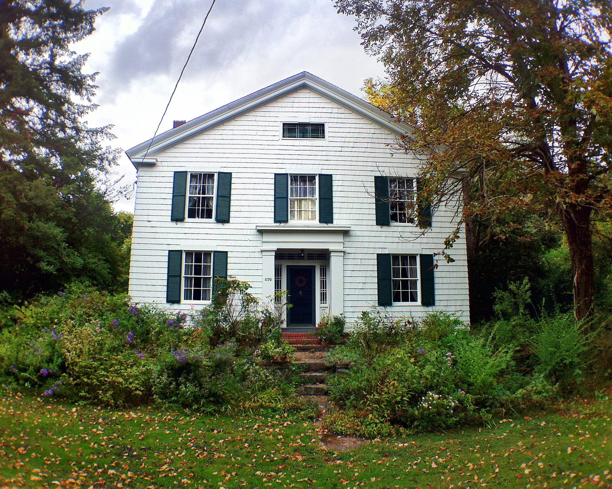 “Willian F. Morgan lived at the next place above [the house pictured at the center of the top row in the photo gallery, below]. My grandfather's farm extended from about half a mile east of the Derby town line to or near the New Haven line on the east. When he died in 1842 seventy-six acres was set off to my uncle Elias Clark from the east end. There were no buildings on it and he soon exchanged it for a place near his old home, owned by David Camp [today's 999 Racebrook Road]. Camp built a house and set out two Norway spruce trees, one each side of the house, both of which stood until recently. One is still standing with the top broken.