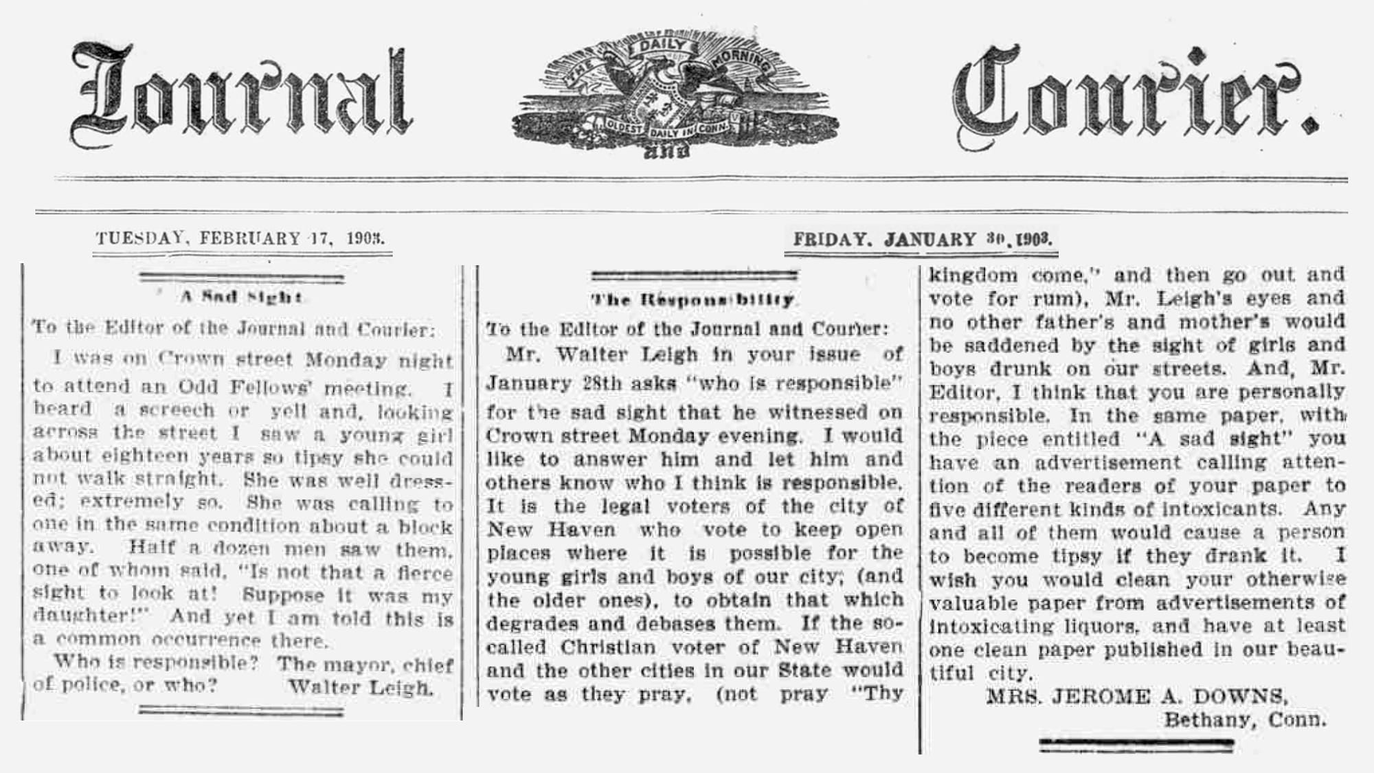 Mr. Walter Leigh in your issue of January 28th asks "who is responsible" for the sad sight that he witnessed on Crown Street Monday evening. I would like to answer him and let him and others know who I think is responsible. It is the legal voters of the city of New Haven who vote to keep open places where it is possible for the young girls and boys of our city (and the older ones), to obtain that which degrades and debases them. If the so-called Christian voter of New Haven and the other cities in our State would vote as they pray, (not pray "Thy Kingdom come," and then go out and vote for rum), Mr. Leigh’s eyes and no other father’s and mother’s would be saddened by the sight of girls and boys drunk on our streets. And, Mr. Editor, I think that you are personally responsible. In the same paper, with the piece entitled "A sad sight" you have an advertisement calling attention of the readers of your paper to five different kinds of intoxicants. Any and all of them would cause a person to become tipsy if they drank it. I wish you would clean your otherwise valuable paper from advertisements of intoxicating liquors, and have at least one clean paper published in our beautiful city.