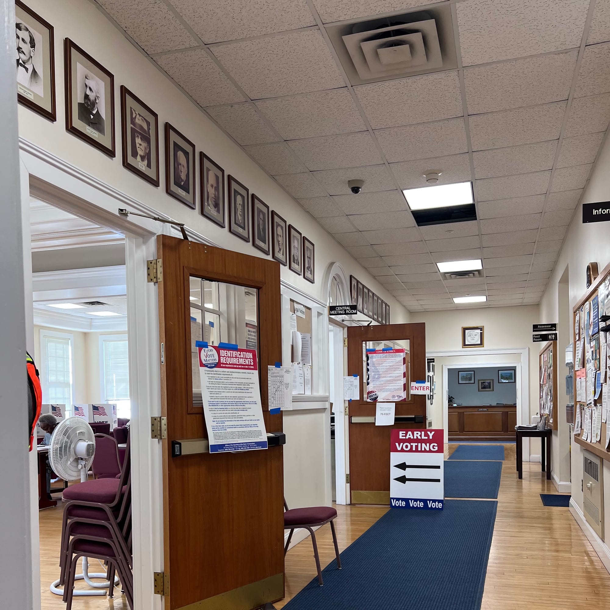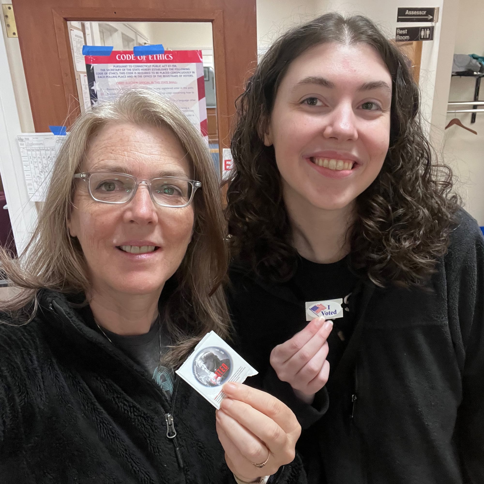Early voting at Woodbridge Town Hall, as past First Selectmen look on from the hallway: Alta's 3rd and 4th great granddaughters vote in the November 2024 presidential election.