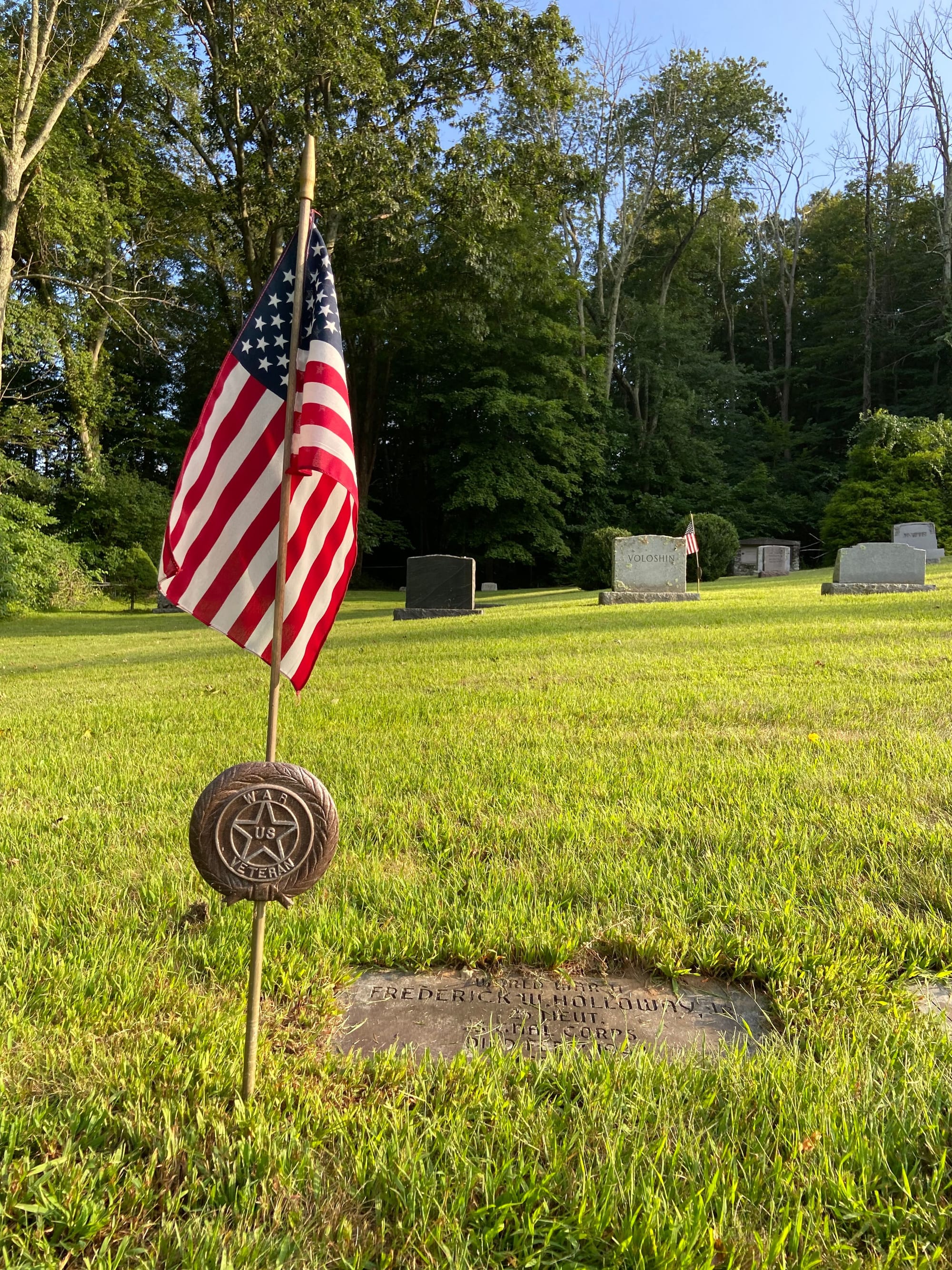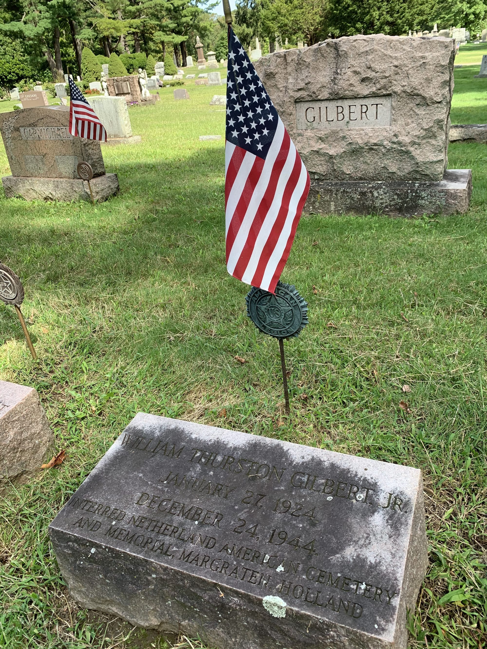 Of the service members listed at Eastside Cemetery at the time of Jason Luciani's Eaglescout Project with troop 907, research had indicated that just two had 'died in action' — William Thurston Gilbert, Jr. (1924-1944) and Frederick Walter Holloway, Jr. (1919-1943). It should be noted that both these young men are actually memorialized at Eastside with what is known as a cenotaph – a monument erected in honor of a person whose remains are elsewhere. These often serve as symbolic memorials for those who died in military contexts, where their bodies might not be recoverable or may be buried in distant locations. In the case of William who died December 24th 1944, the gravestone in the Gilbert family plot states that he is "interred Netherland American Cemetery and Memorial, Margraten, Holland."