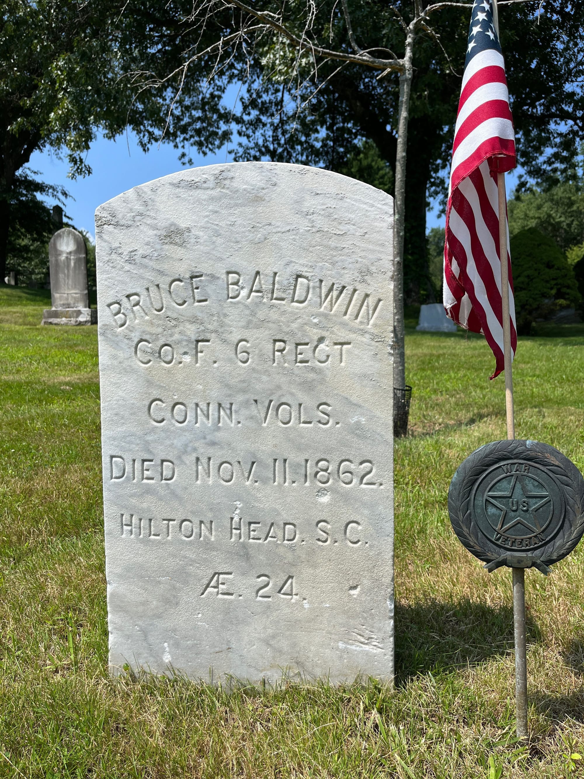 Other cenotaphs at Eastside Cemetery include one that honors Bruce Baldwin (1838-1862) who died at age 24 while serving with Company F of the 6th Infantry Regiment, Connecticut Volunteers during the Civil War. Bruce died on November 11, 1862 in Hilton Head, South Carolina and is also memorialized there with a veteran's gravestone in Beaufort National Cemetery where his body is likely interred.