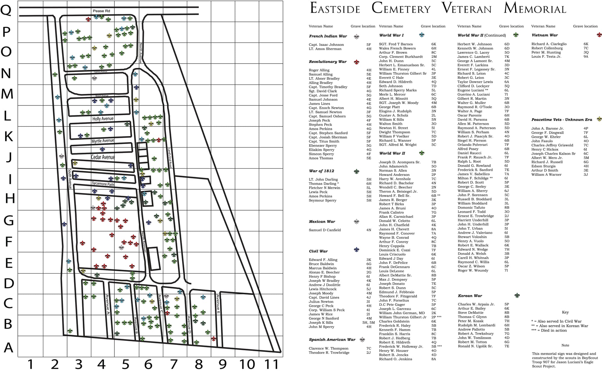 Additional veteran's graves at Eastside, many for individual's interred since the Eaglescout Project's listing was printed for the cemetery's display, are included in the memorial pages at the website of Find A Grave.