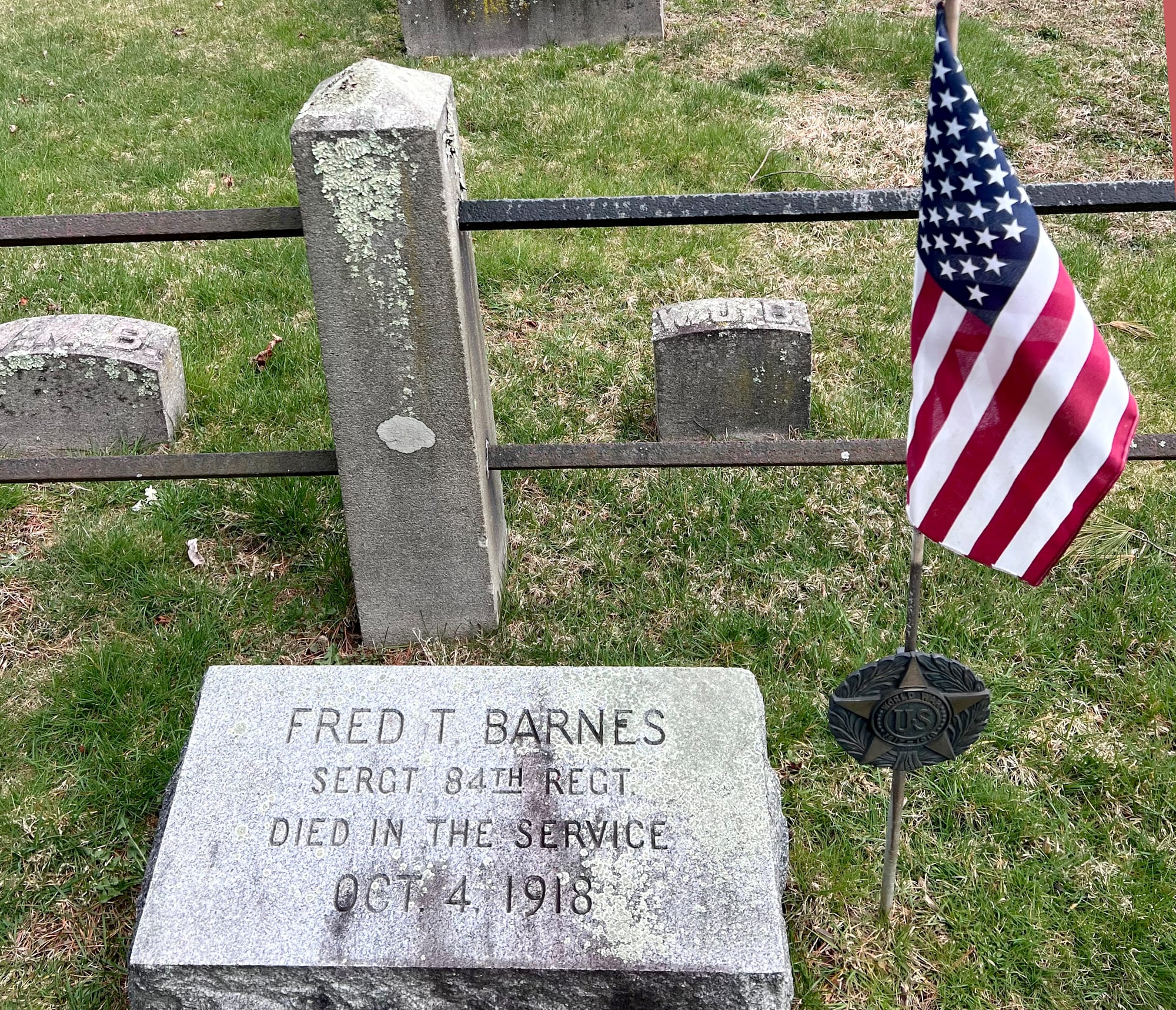 Another young man who gave his life in service to the country is honored with a flag on Memorial Day and throughout the year, Fred Thornhill Barnes (1891-1918). He was a 26 year-old Sergeant serving with Company K of the 84th U.S. infantry when he died of Lobar Pneumonia on October 4th 1918. These were the earliest days of what would become known as the Spanish Flu — a pandemic illness likely as contagious and deadly as the COVID19 virus that appeared just over 100 years later — which was spreading rapidly among service members in the fall of 1918.