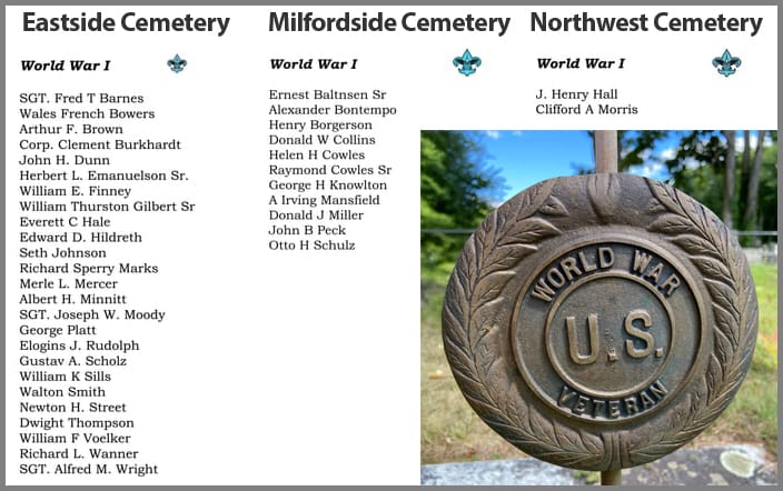 One source of local information is the listings in each of the three Woodbridge cemeteries on the signposts constructed in 2019 by Jason Luciani for his Eaglescout Project with troop 907. Those men — and at least one woman — listed as serving from our community during The Great War are: