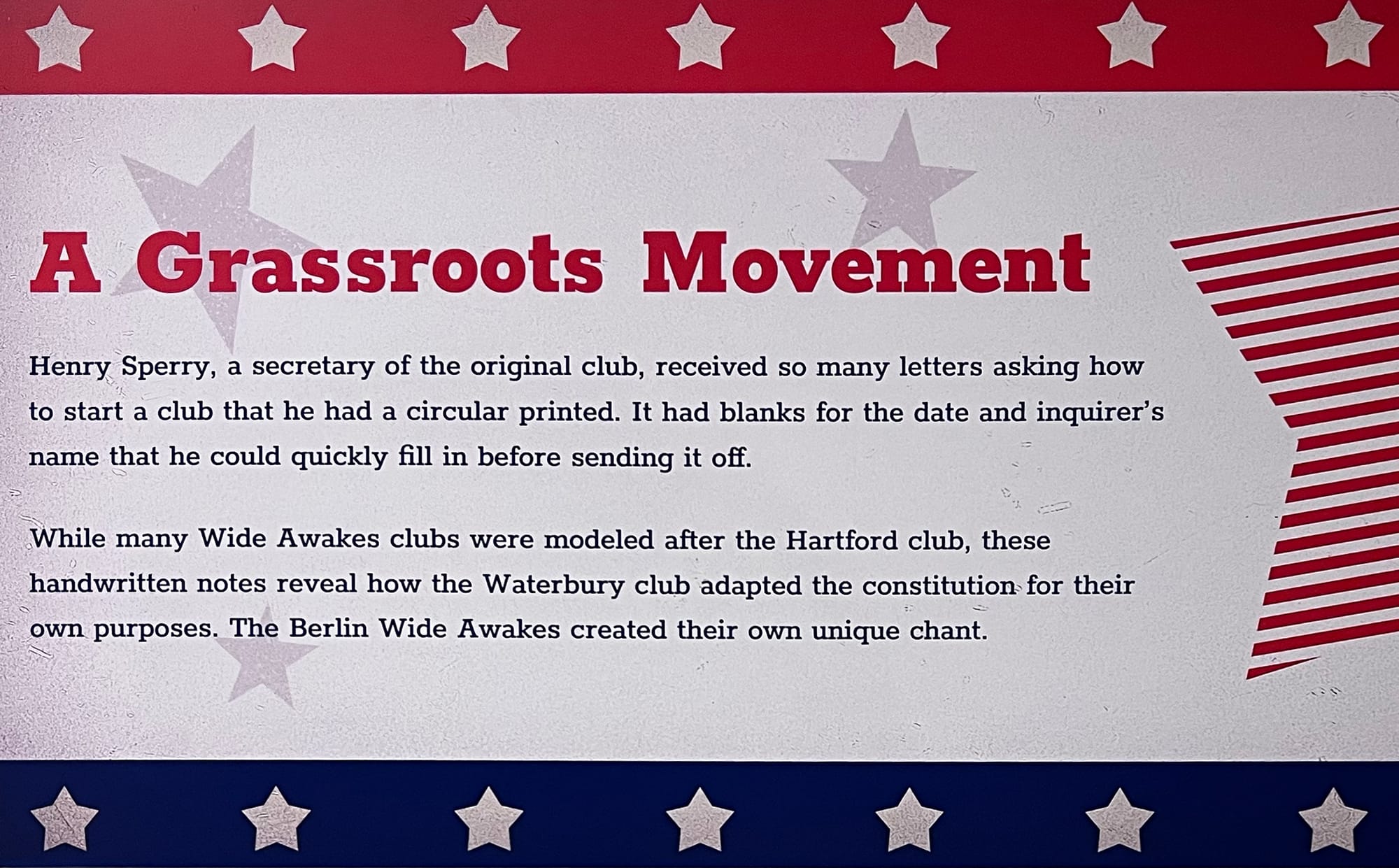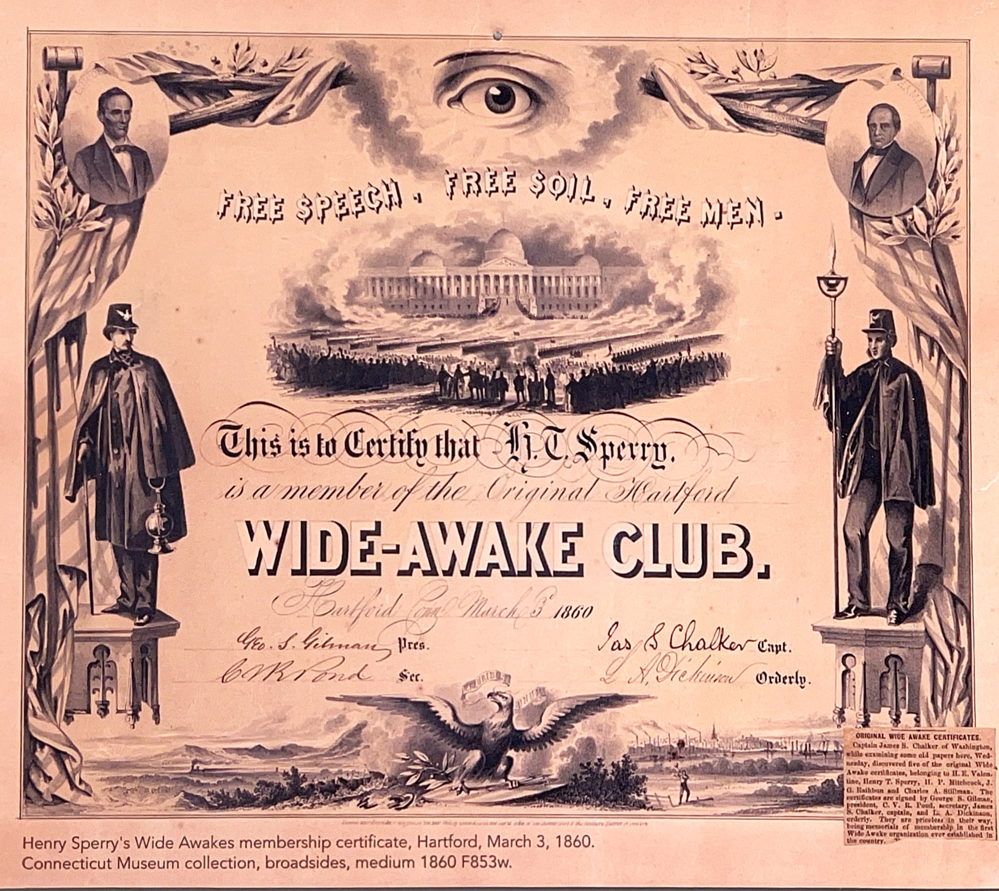 A current exhibit at the Connecticut Museum of Culture and History on Elizabeth Street in Hartford offers a glimpse into the past — and in doing so, illuminates another chapter of Sperry Family history. The exhibition, Wide Awakes: Campaigning for Lincoln, runs through March 16, 2026 and is well worth a visit. It features artifacts that tell a story set “during a time of deep political division and fears of a civil war.” According to the museum website: