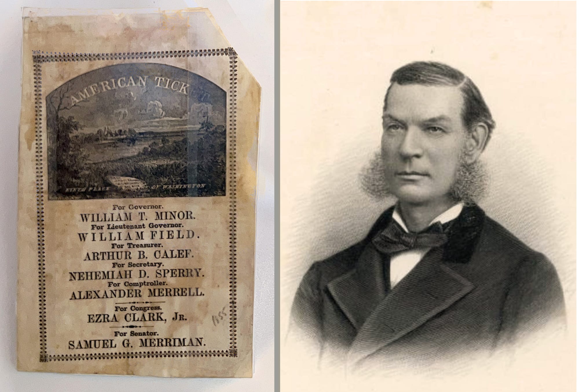 At the entryway to the exhibit, an array of artifacts from political campaigns that led up to the dramatic presidential election of 1860 were showcased. In this display I was surprised to see a familiar name pop out at me — none other than Woodbridge's very own Nehemiah Day Sperry (1827-1911), listed as a candidate for Secretary of the State of Connecticut on the “American Ticket.” Members of this ticket won election, and Nehemiah served from May 2, 1855 to May 6, 1857 under William Thomas Minor, the 39th Governor of Connecticut. (Fun fact: our current, 89th Governor, Edward Miner (Ned) Lamont, Jr., is Gov. William Minor's 5th cousin, five times removed.)