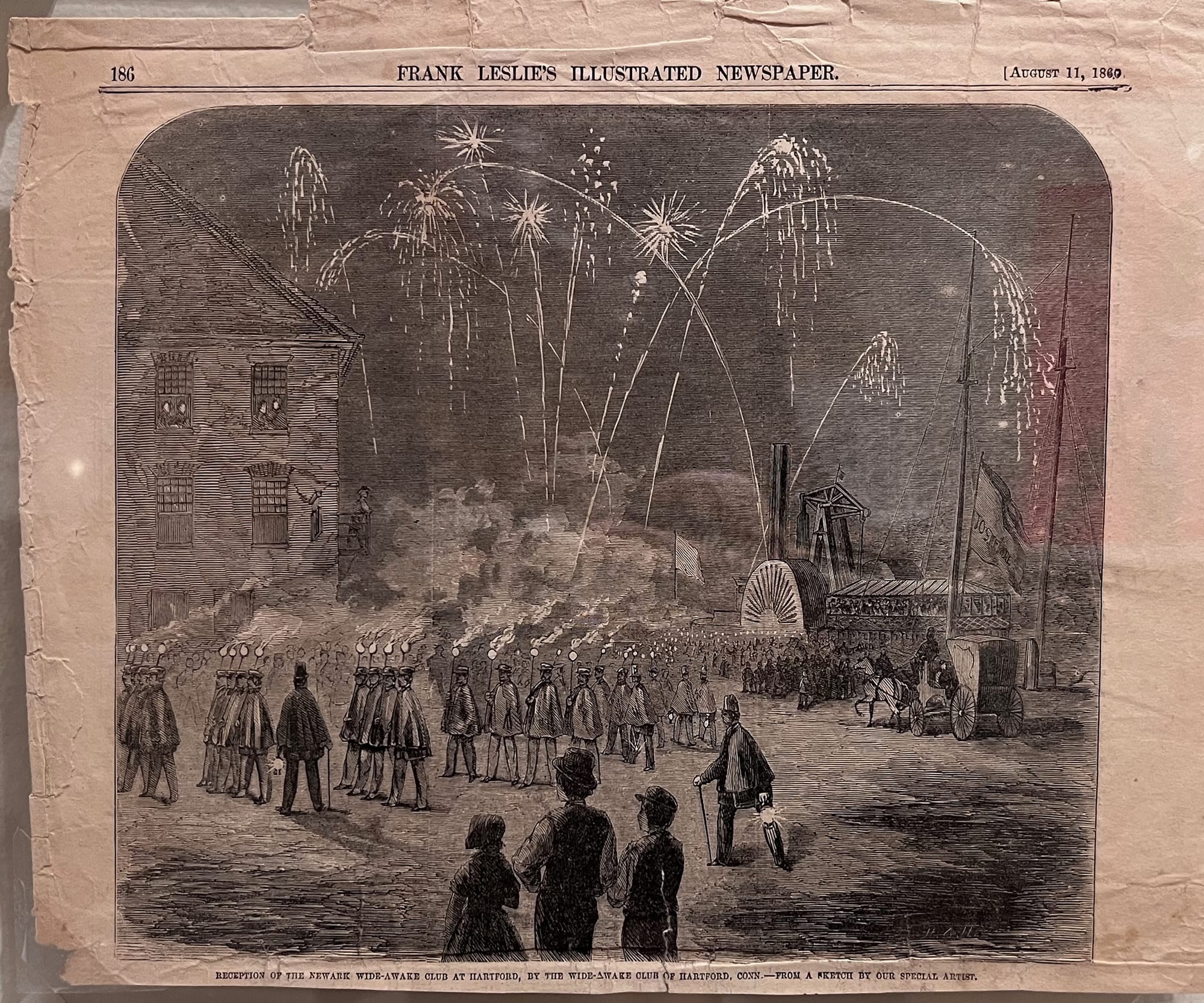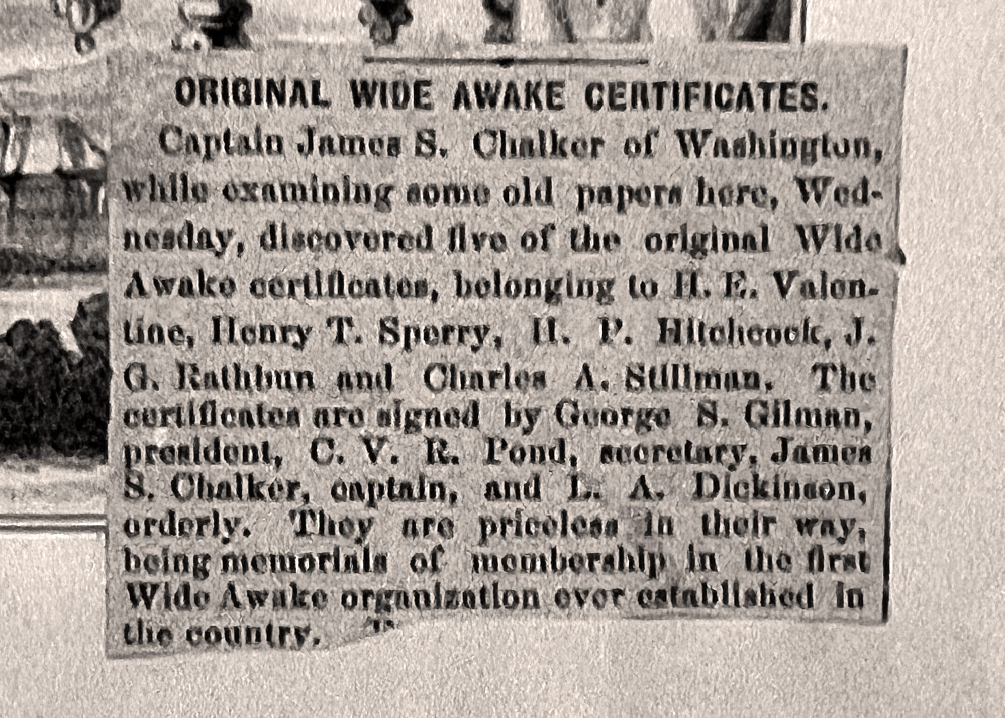 The news clipping that accompanies the certificate (bottom right corner of the display) describes the discovery of five of these certificates and states that they are “...priceless in their way, being memorials of membership in the first Wide Awake organization ever established in the country.”