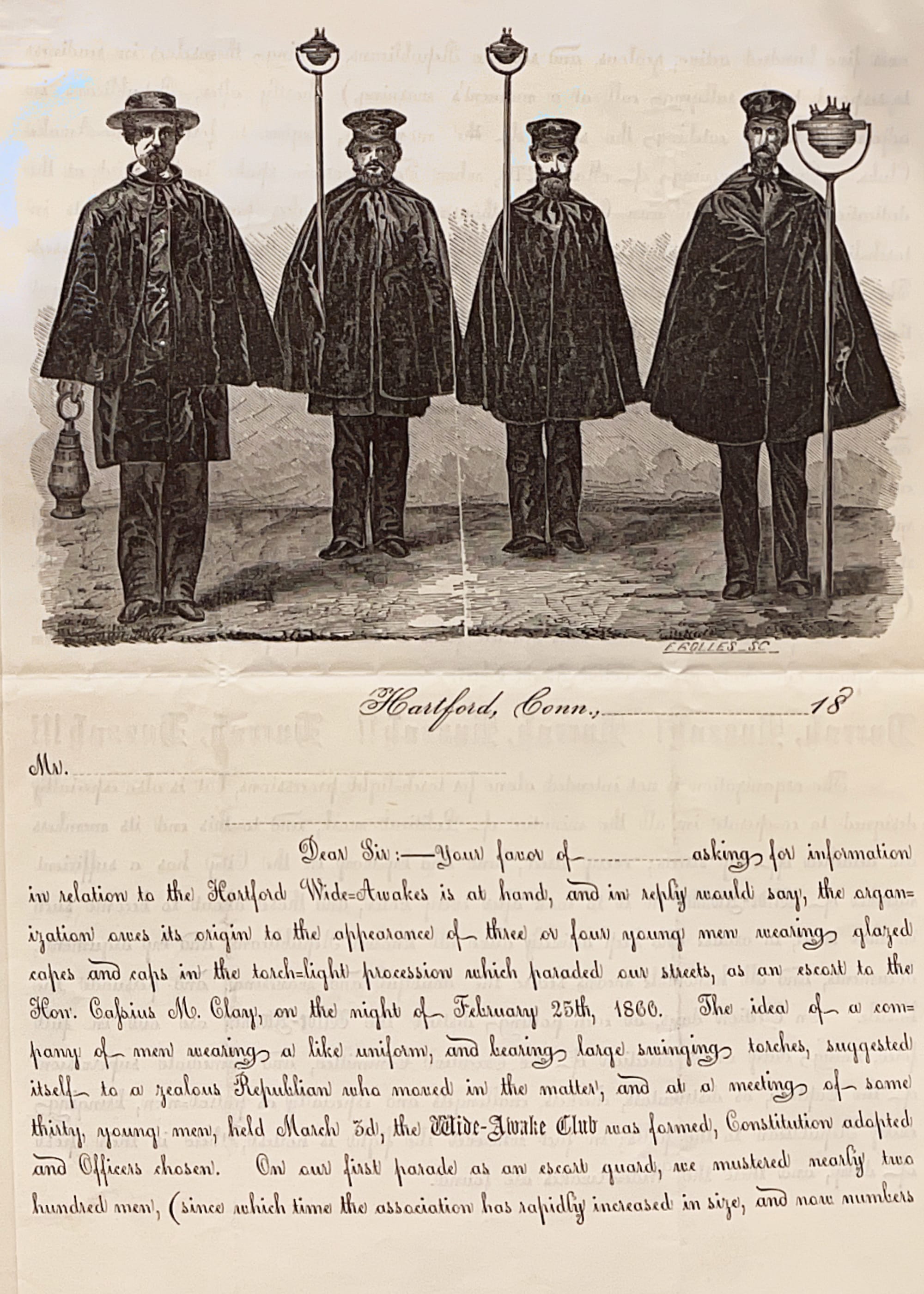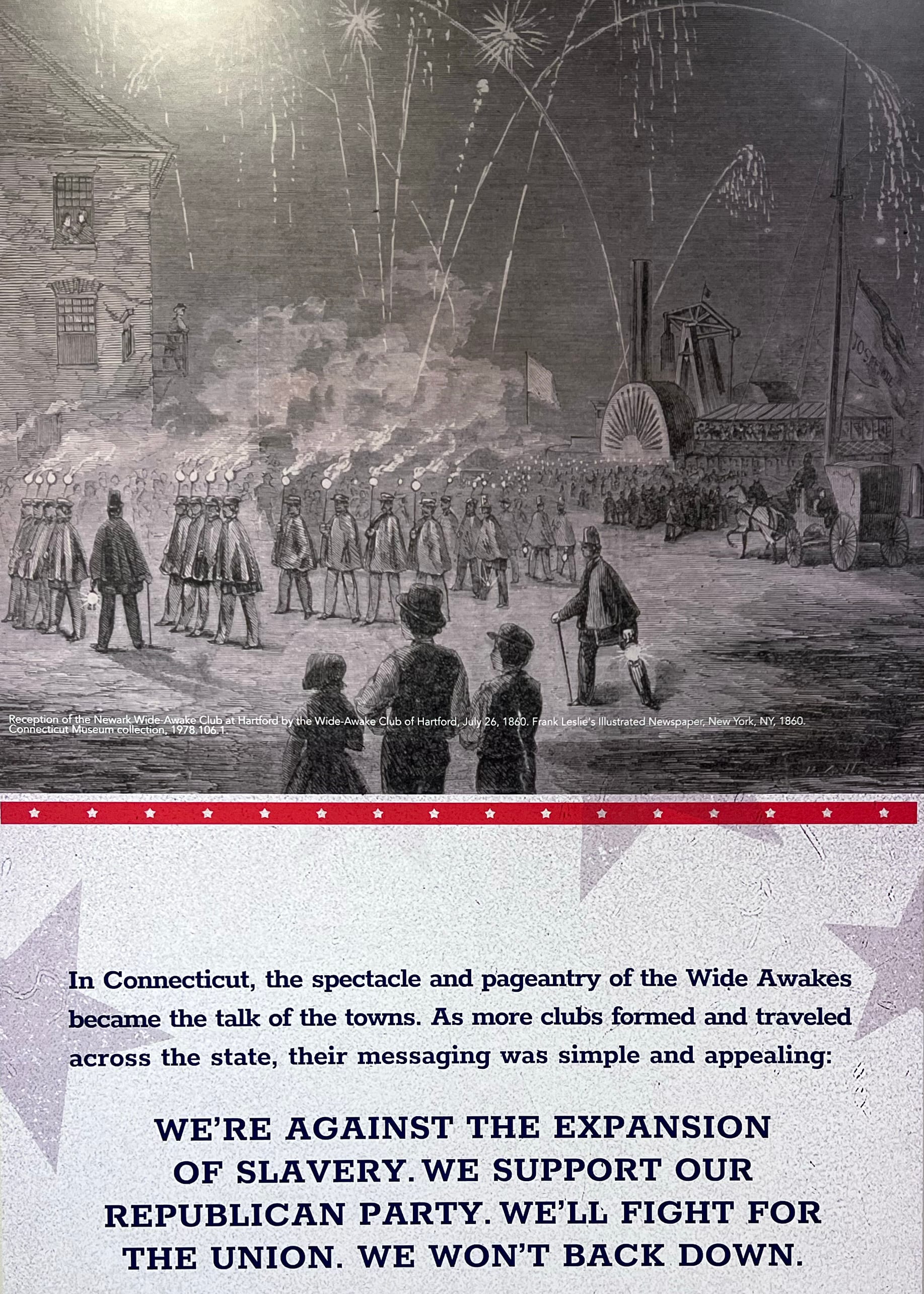 “This exhibition will transport you to the cusp of the election of 1860, when the political landscape was tense and the issue of slavery remained at the forefront. Discover the formation and rapid spread of the original Wide Awakes, a grassroots Republican campaign organization founded in Hartford, Connecticut, that rallied and paraded in support of Abraham Lincoln during the presidential election of 1860. They donned capes as uniforms, held torches and signs bearing an iconic eye symbol, and matched their bold image with bold actions.”