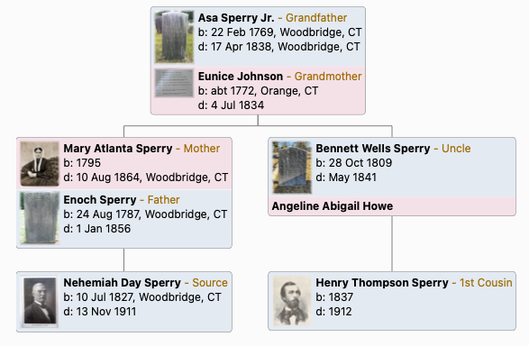 Visiting the museum this week, I was looking for information that might add context to the Sperry family connection I already knew about: one of my 4th cousins, five times removed, was Henry Thompson Sperry (1837-1912) who I had recently learned served as the Secretary of the Hartford Wide Awakes. Henry was a 4th great-grandson of Richard and Dennis Sperry, the couple who settled in what is now Woodbridge in the mid-1640s, though their son Richard Jr. and his wife Martha Mansfield (from whom my line also descends).