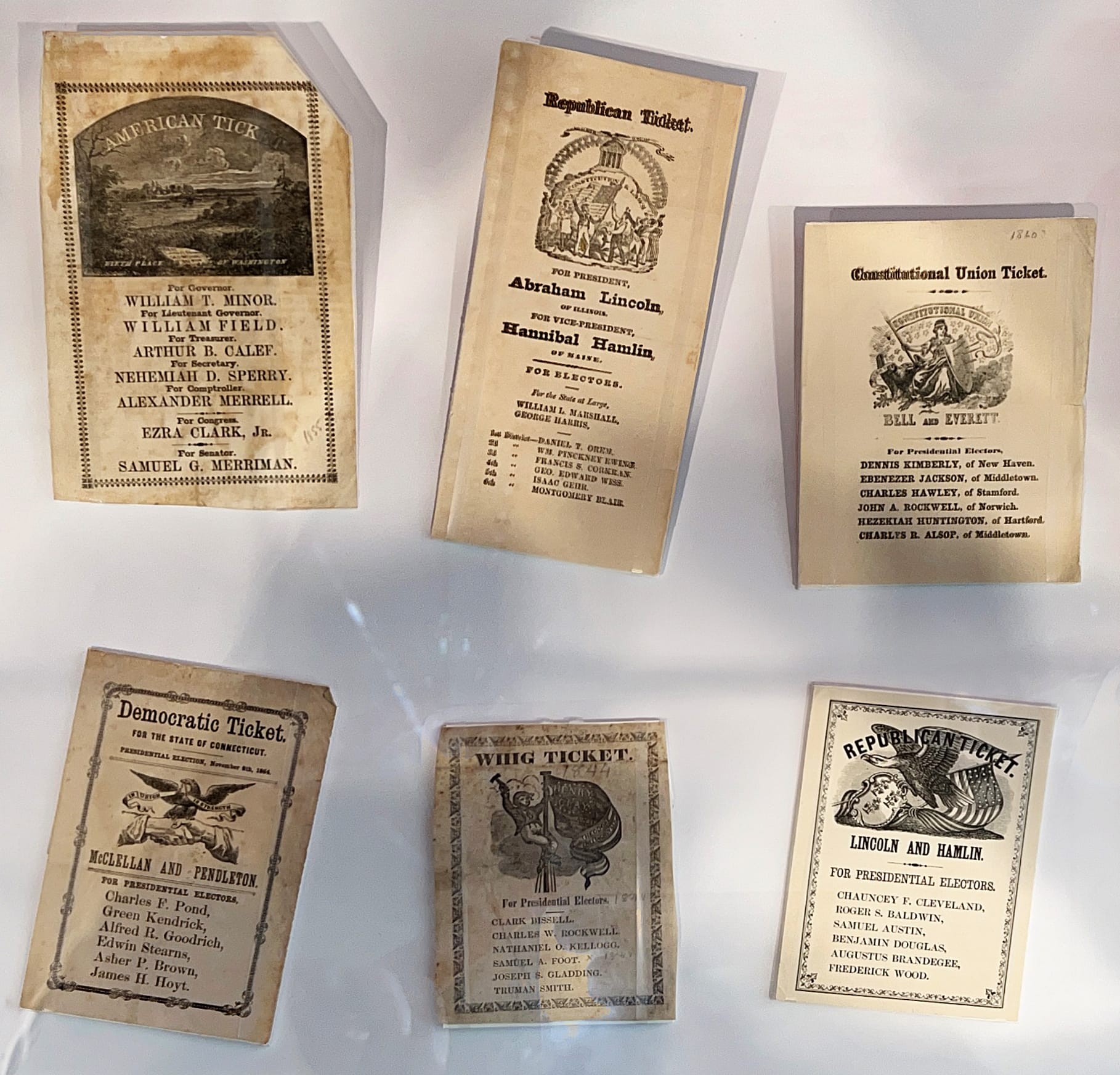Various campaign tickets on display, the American Ticket of 1855, and candidate for Secretary of the State, Nehemiah D. Sperry at about this time.