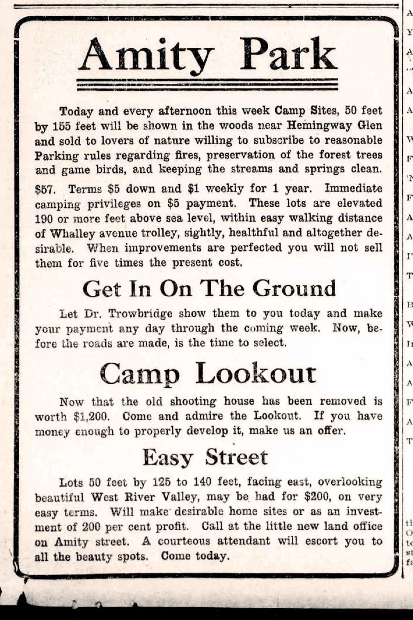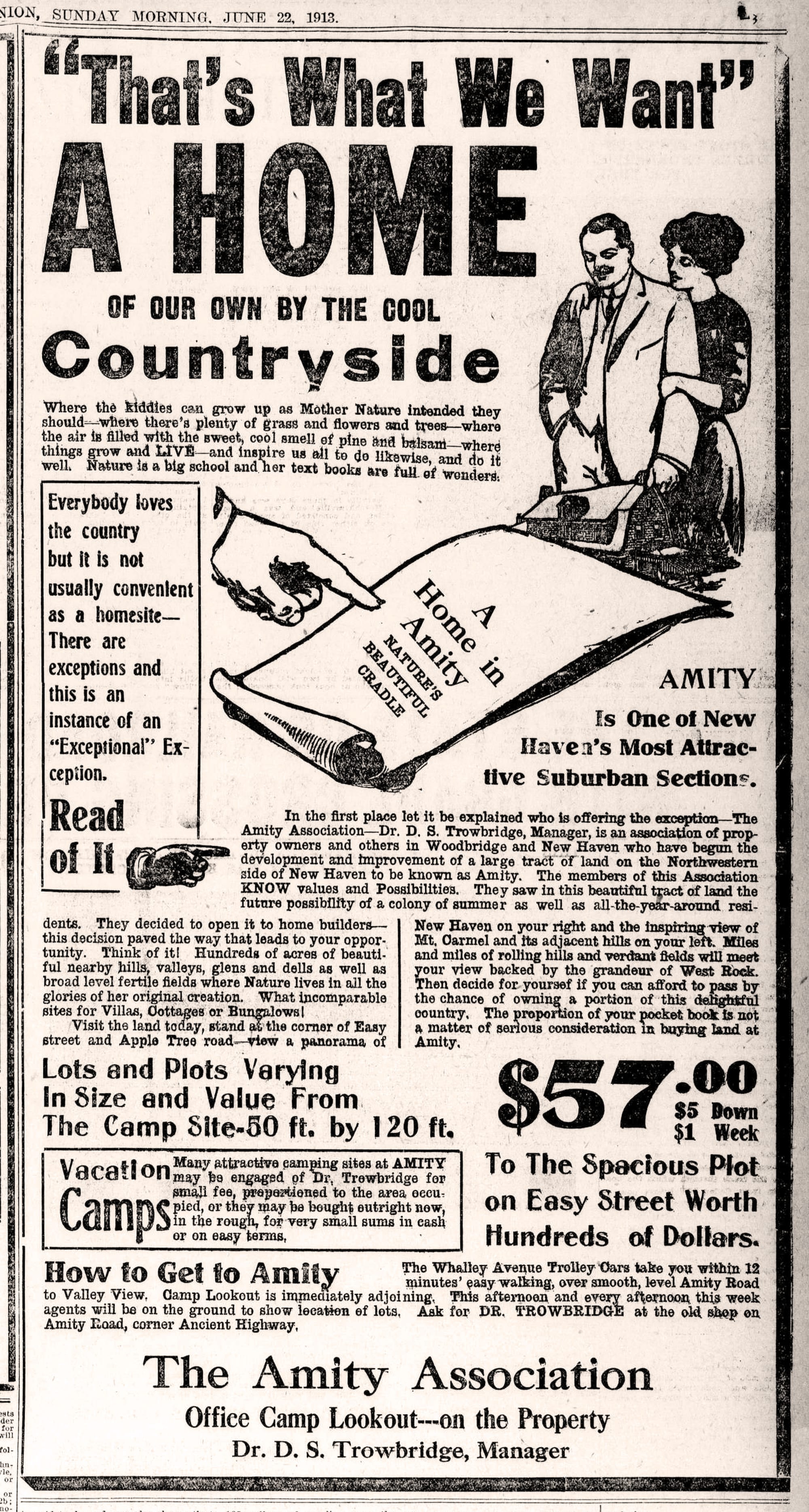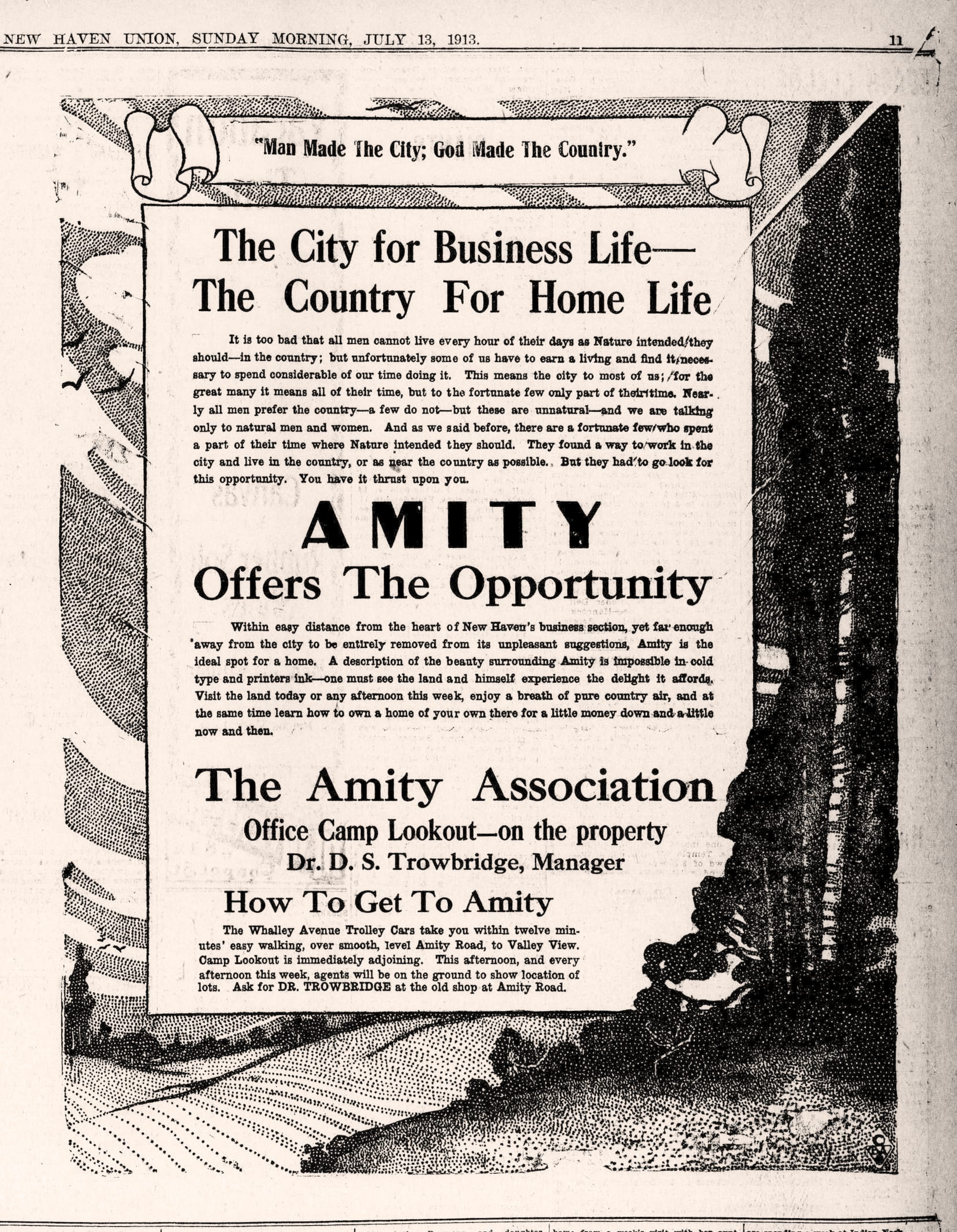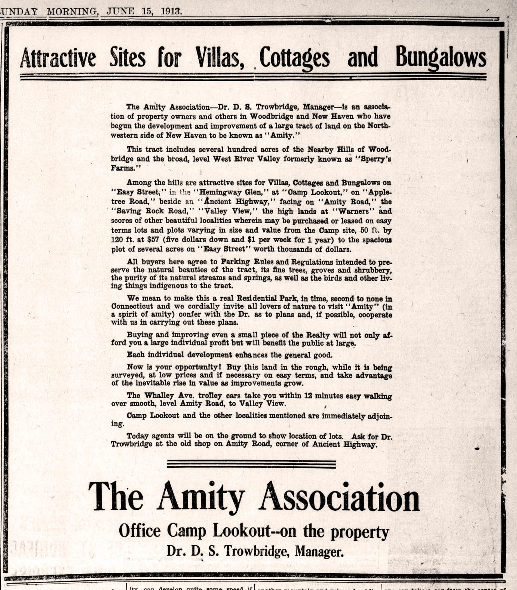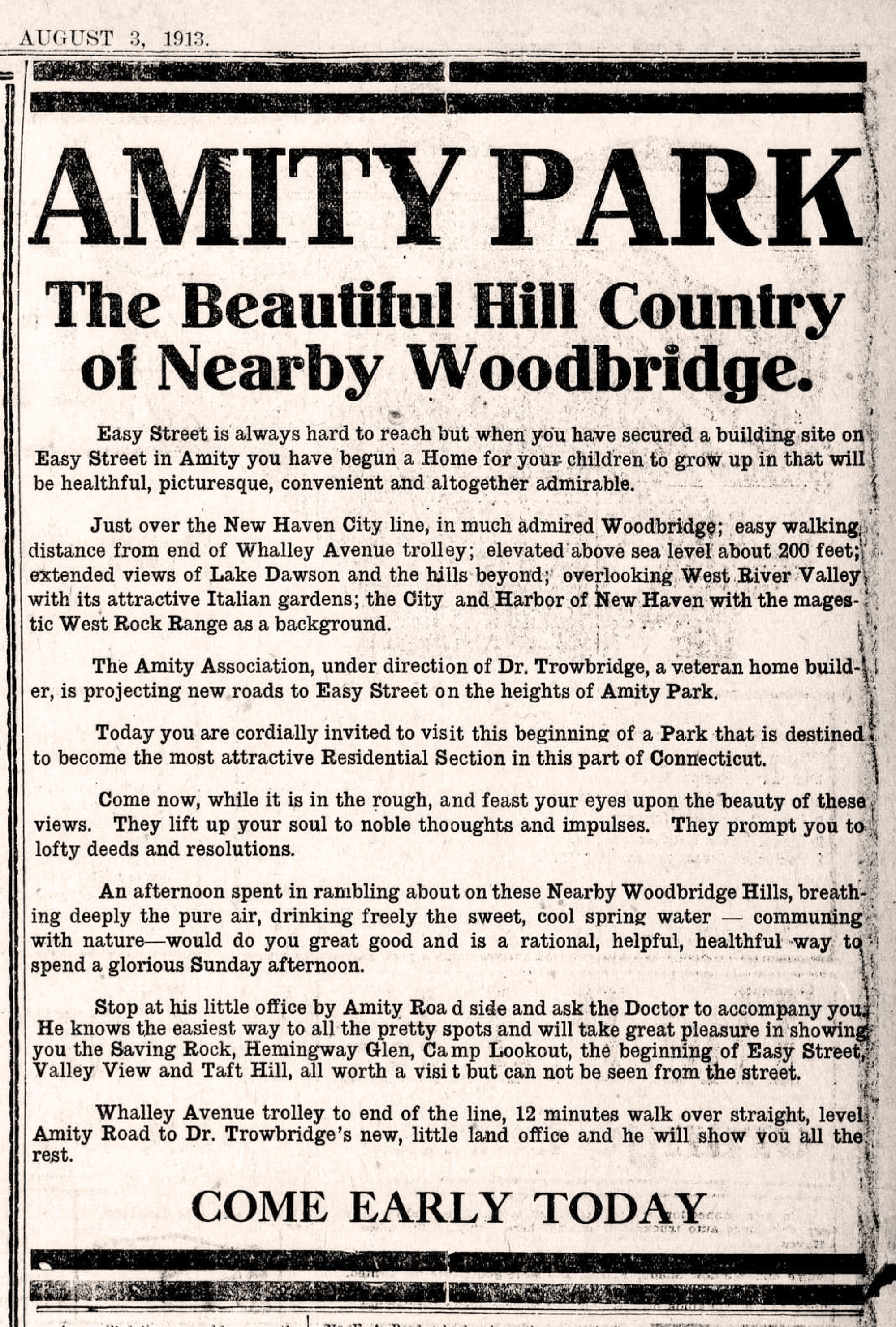 In fact, a series of advertisements that ran in the New Haven Union newspaper during the summer of 1913 promoted this same area's land for sale, with a focus on its natural beauty, health benefits, and proximity to the city. The ads provide a fascinating glimpse back in time to remind us of some of the enduring qualities of Woodbidge. While many of these descriptions may still resonate with today's residents, it's interesting to see how the attributes of the land were conveyed to daily newspaper readers more than 100 years ago: