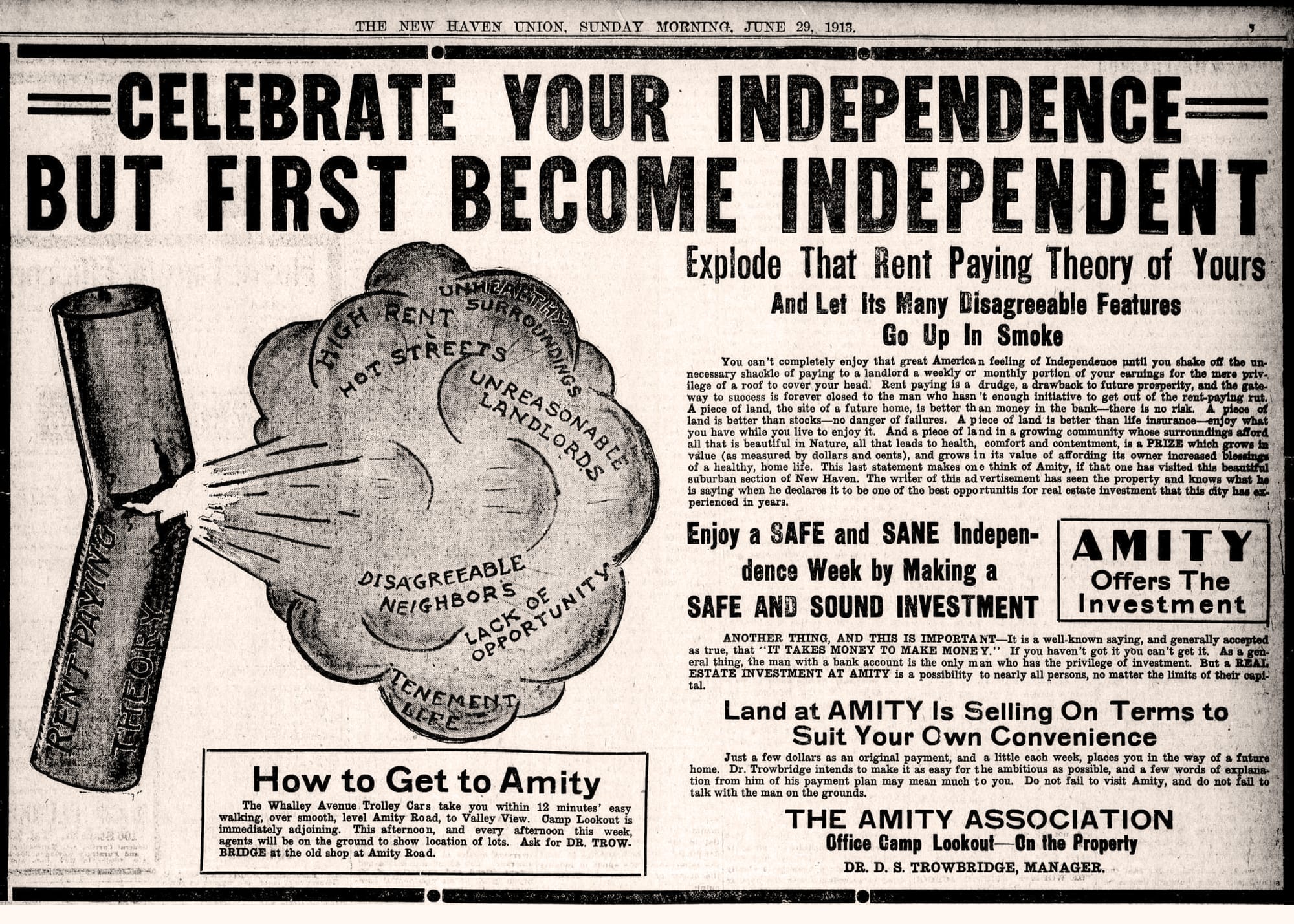 The land for sale is also presented as a safe and wise investment, better than stocks or renting, with the potential for future appreciation. The ads inform readers that they can come visit Woodbridge to see the property for sale, calling upon “Dr. D. S. Trowbridge, the manager of the Amity Association” who is described as overseeing the development, to show them around. The ads stress that flexible payment plans are offered to make homeownership accessible: