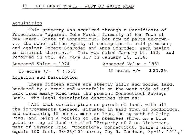 Robert Adolf Schroder (1883-1958) was born in Germany and settled in the New Haven area with his wife Anna Siebold Schroeder (1886-1970) and children around the turn of the century. They are the couple referenced in the CUPOP record for the 15-acre parcel known as the Old Derby Trail, which has been owned by the Town of Woodbridge since 1936. The address of this property is actually 80 Park Lane – which helps orient us to this area of Woodbridge that is unconnected by present day through roads, but was once traversed by well-used trails. The Town website's Tax Map provides a helpful visual: