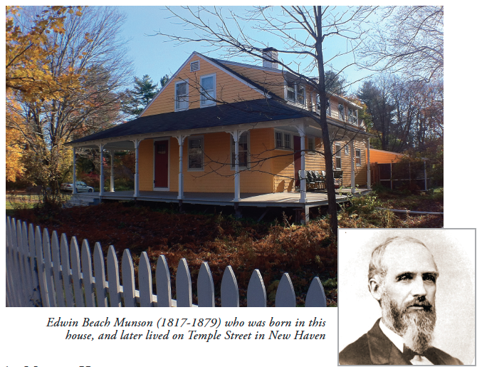 Three of Wyllys and Catherine Sperry’s daughters — Amelia, Eliza, and Mary — would celebrate marriages in Woodbridge in the decade of the 1840s, beginning in June 1841, when at age 19 Amelia Catherine Sperry (1822-1906) married the 24 year-old Edwin Beach Munson (1817-1879). According to the Historic Woodbridge book in which the family’s home at 120 Rimmon Road is featured, Edwin was one of four sons of Charles Munson (1792-1879), a shoemaker and farmer, and his wife Mabel Beach (1792-1878), who built their home about the time of their marriage in 1815.
