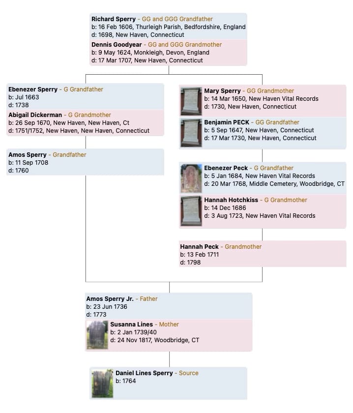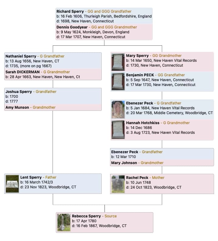 Wyllys Sperry (1794 – 1869) was a son of Daniel Lines Sperry (1764-1841) and Chloe Alling Sperry (1766-1856), who raised their family in Woodbridge where both of Daniel’s parents traced their family back to Richard and Dennis Sperry (making Daniel a 2nd and 3rd great-grandson of this couple).