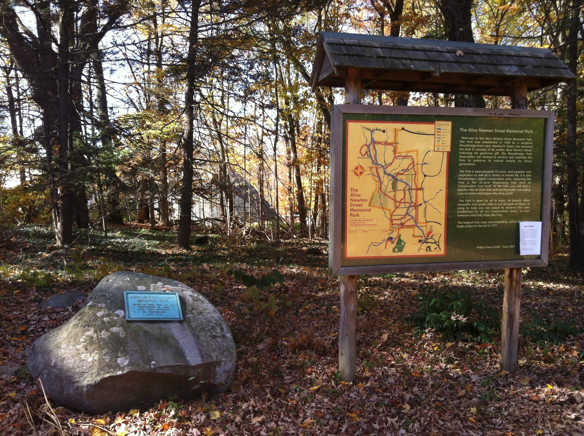 The Woodbridge Park Association, founded in 1928, is Connecticut’s third-oldest land trust. Its mission is rooted in ecological preservation, historical protection, and fostering public access to nature. Key highlights include the Alice Newton Street Memorial Park, established with an 82-acre donation from Newton Herbert Street (1895-1979) in memory of his mother, Alice May Newton Street (1953-1928). The Historic Woodbridge book notes that Alice had been born while her family lived in an old family house on Newton Road nearby the future park: