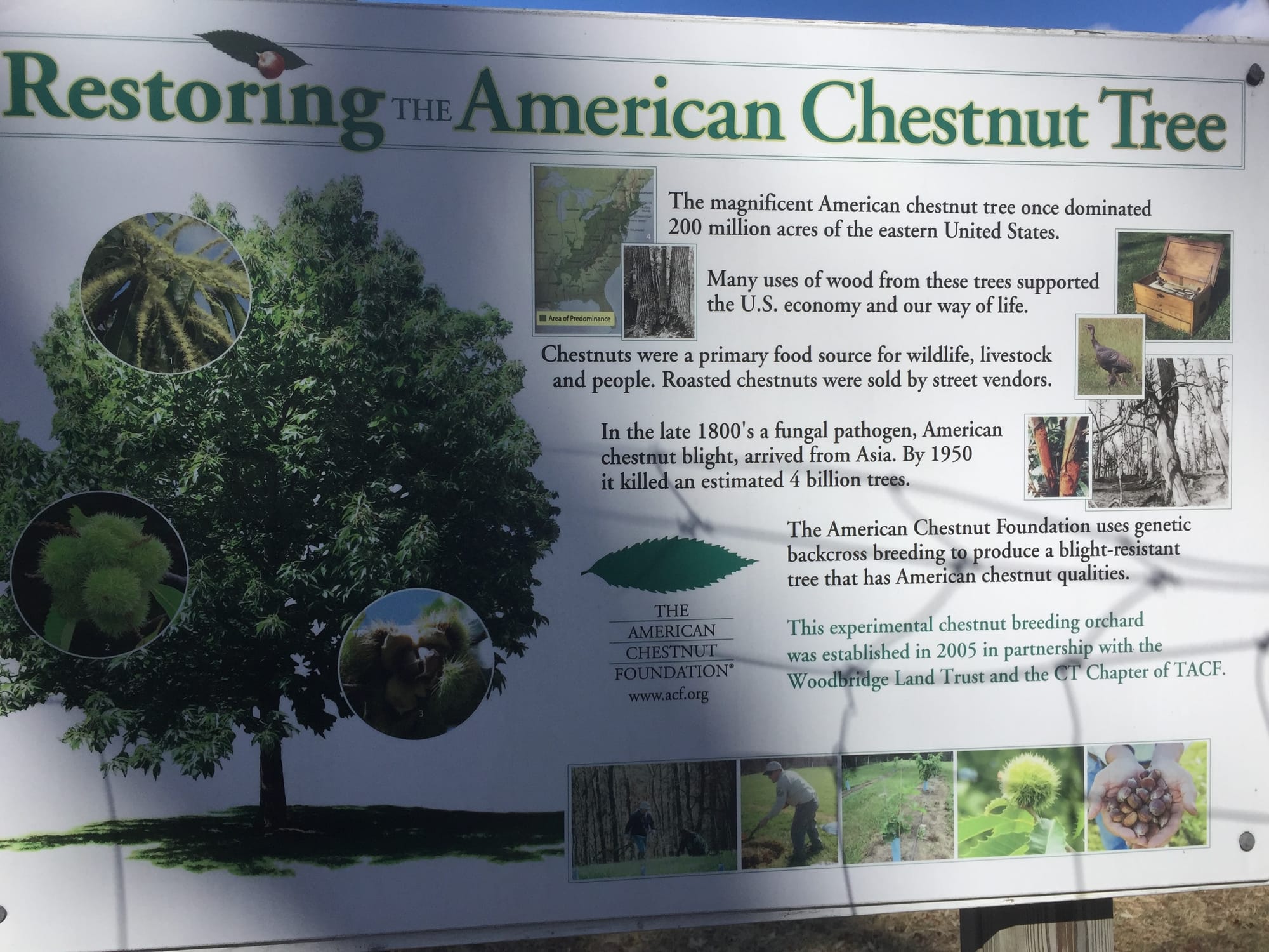 The Trust is also at the forefront of conservation innovation, hosting one of only seven American Chestnut Research Orchards in Connecticut. Located at the Fitzgerald Walking Trails, this orchard is part of a broader effort with the American Chestnut Foundation to develop disease-resistant trees and begin to repopulate the species.