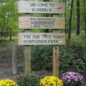 The Land Trust's sign at the FitzGerald Tract describes its Chesnut Orchard project, while another sign marks the entry to the Elderslie Preserve.