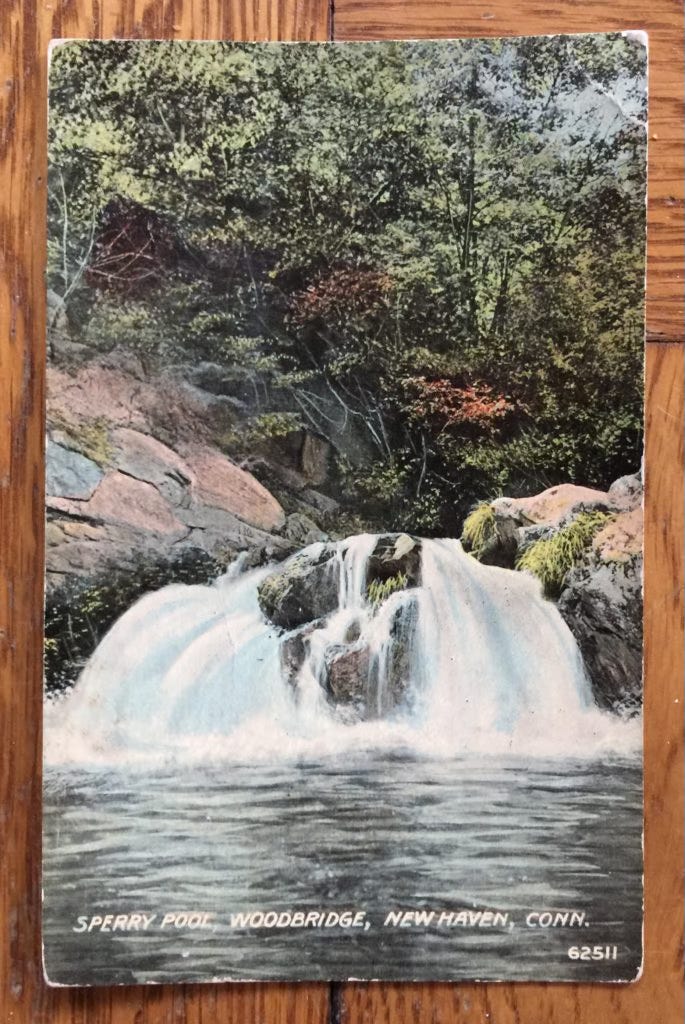 A vintage postcard, postmarked in 1914, showing "Sperry Pools" shortly after Nehemiah Sperry and his family donated the Sperry Homelot property to the Town of Woodbridge to create Sperry Park.