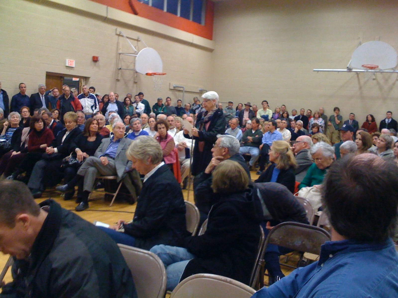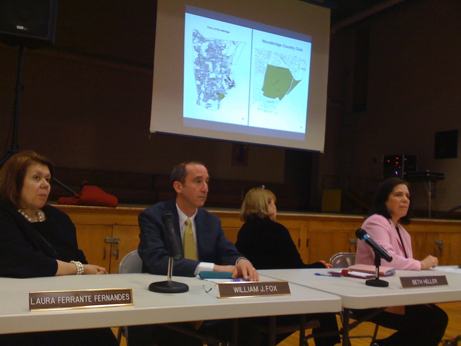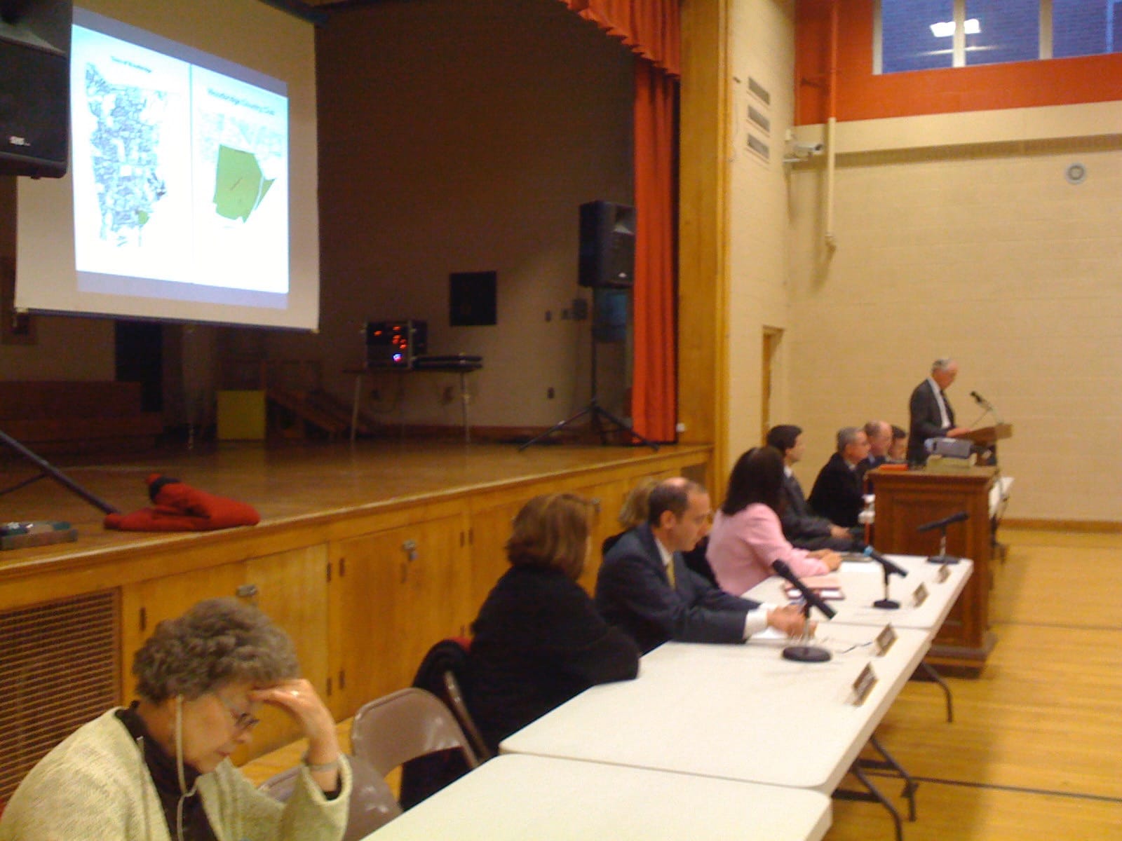 At a Special Meeting of the Board of Selectmen held on November 1, 2011 in the Center Building Cafeteria, this proposal to sell a 17-acres portion of the property was discussed, and at the November 9th regular meeting, the Selectmen voted to proceed to send the proposed sale to referendum. The Woodbridge Conservation Commission at its regular November 2011 meeting considered making a recommendation either in favor or against the proposal but a motion to weigh-in failed with 3 votes in favor, 3 against, and 1 abstention. Two additional information sessions were held to discuss the proposed sale, and again citizens filled the Center Gym, on November 15th and 30th, to discuss the pros and cons of the proposal in depth.