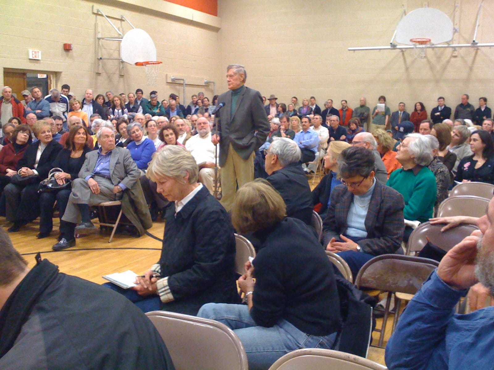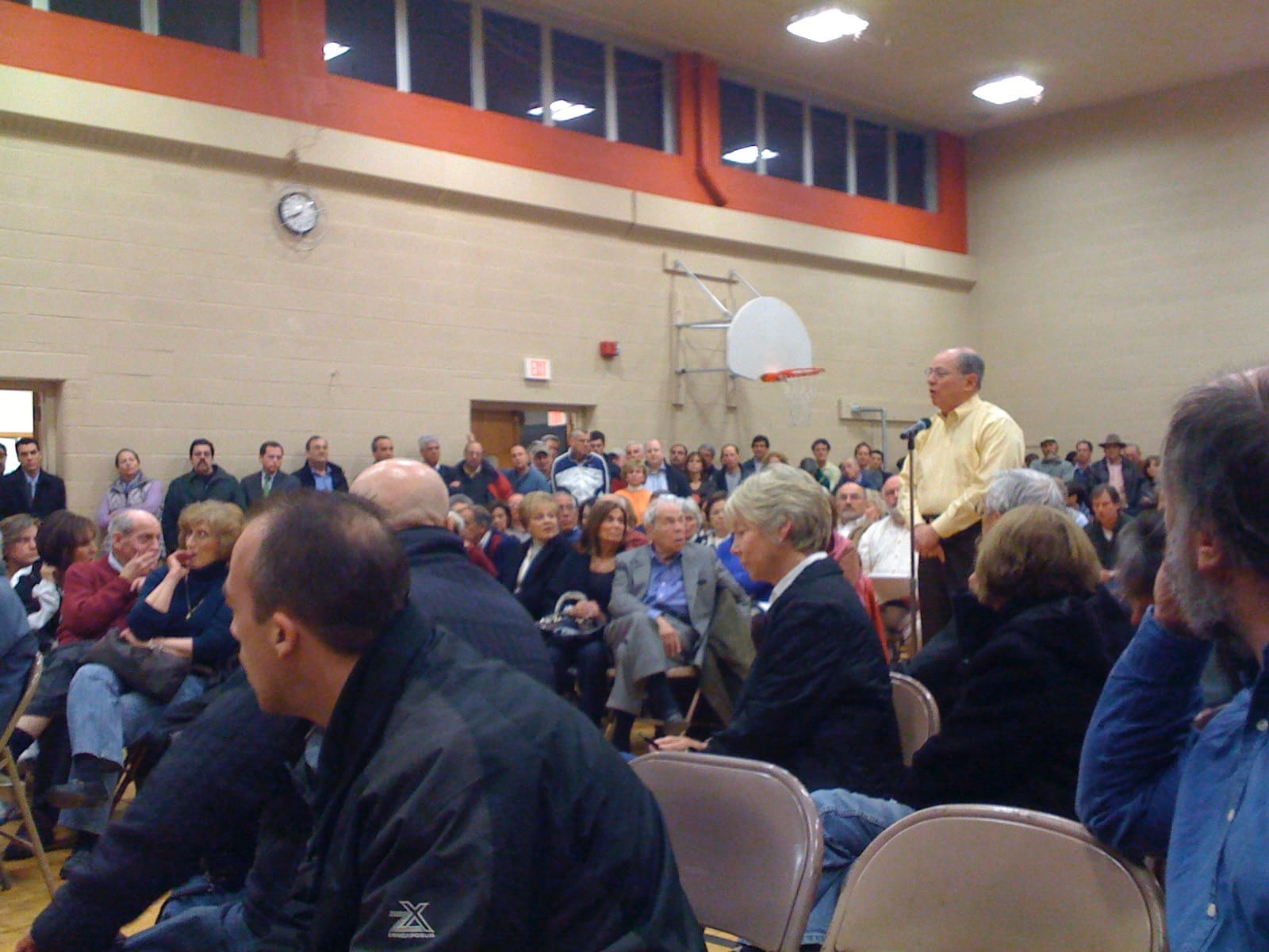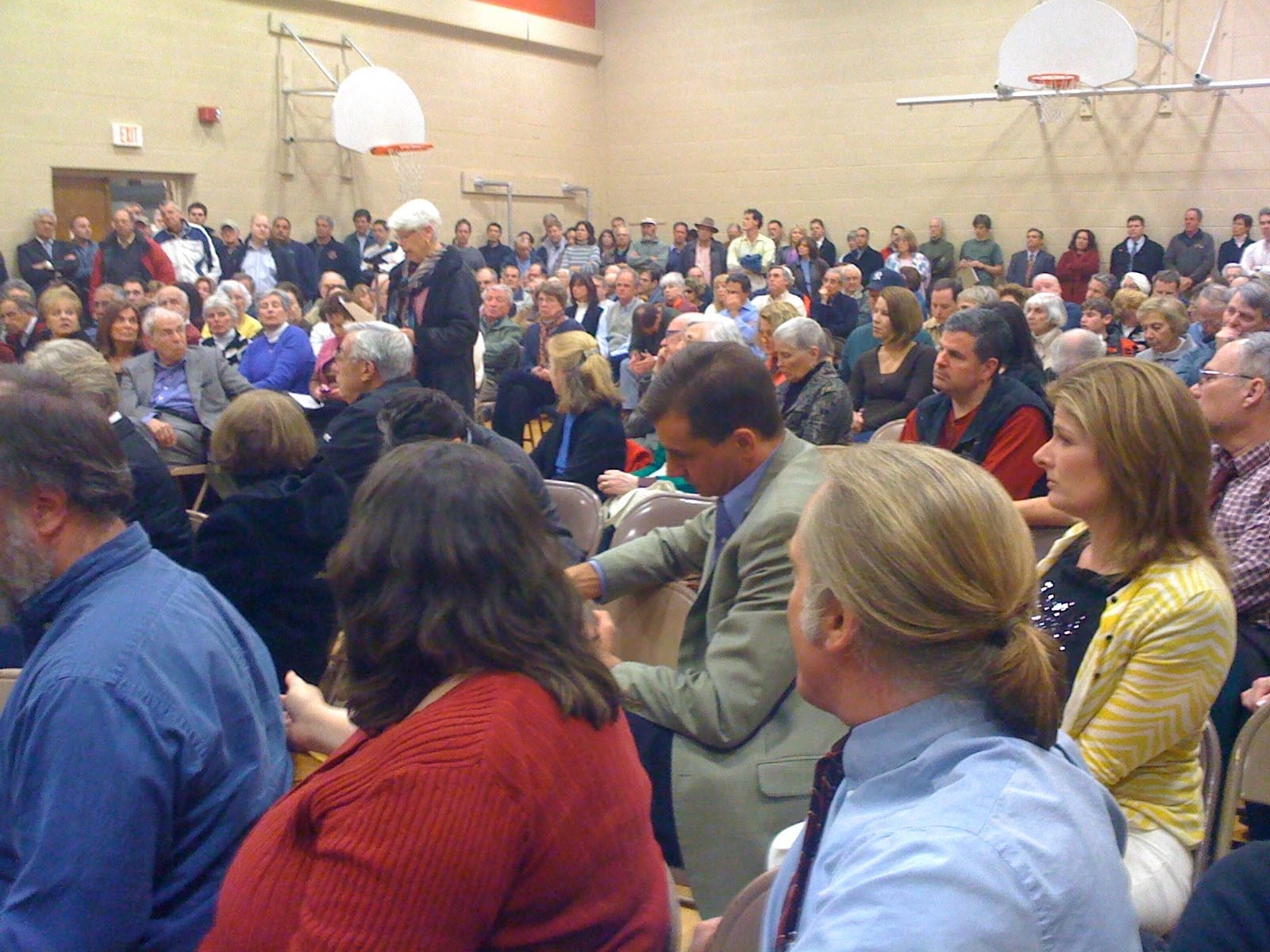 At a Special Meeting of the Board of Selectmen held on November 1, 2011 in the Center Building Cafeteria, this proposal to sell a 17-acres portion of the property was discussed, and at the November 9th regular meeting, the Selectmen voted to proceed to send the proposed sale to referendum. The Woodbridge Conservation Commission at its regular November 2011 meeting considered making a recommendation either in favor or against the proposal but a motion to weigh-in failed with 3 votes in favor, 3 against, and 1 abstention. Two additional information sessions were held to discuss the proposed sale, and again citizens filled the Center Gym, on November 15th and 30th, to discuss the pros and cons of the proposal in depth.