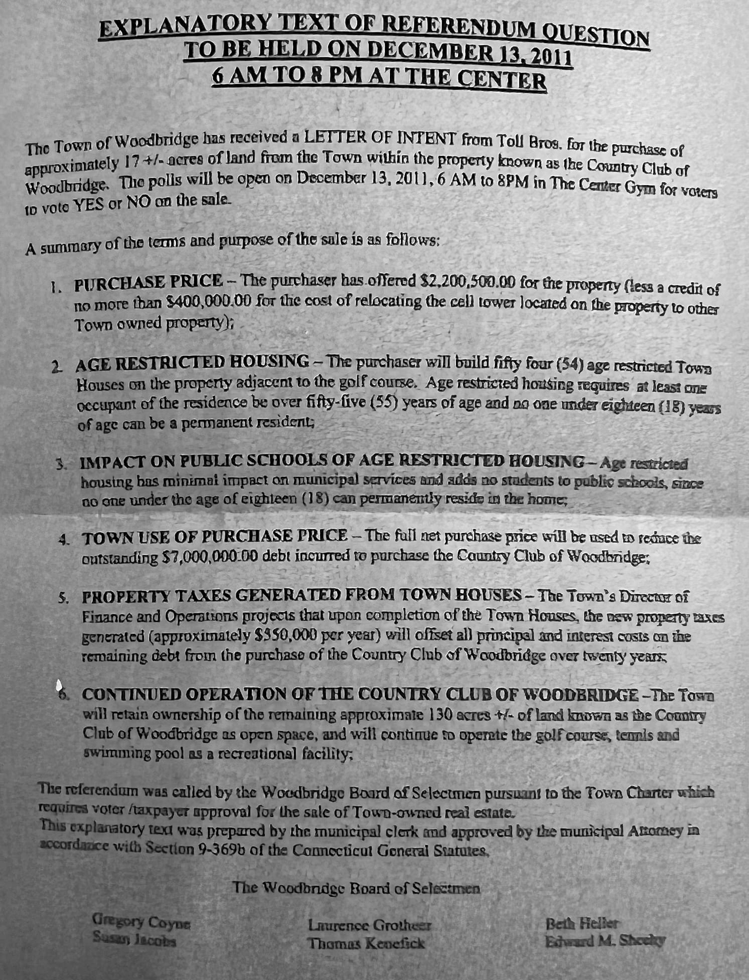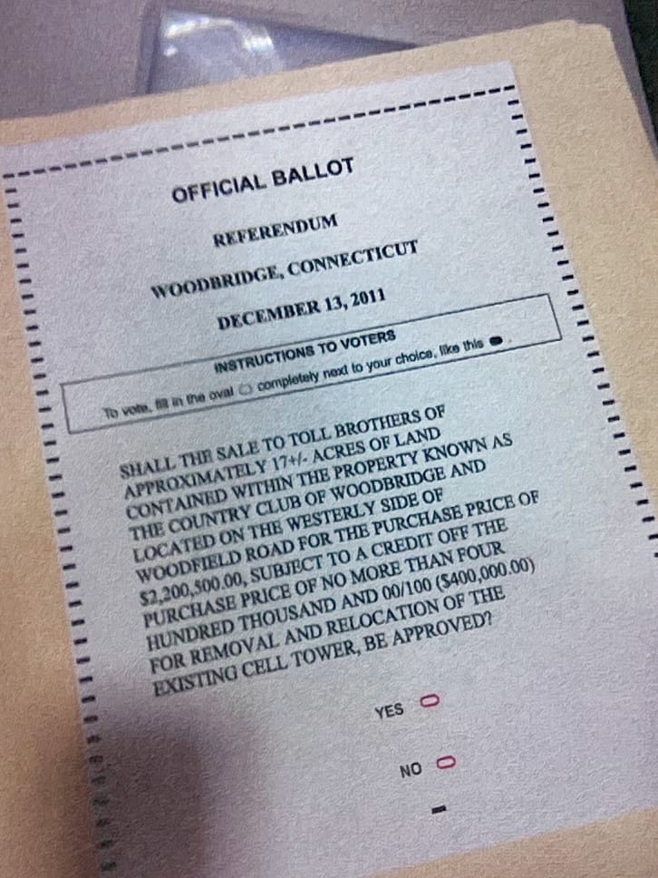The Town of Woodbridge has received a LETTER OF INTENT from Toll Bros. for the purchase of approximately 17 +/- acres of land from the Town within the property known as the Country Club of Woodbridge. The polls will be open on December 13, 2011, 6 AM to 8PM in The Center Gym for voters to vote YES or NO on the sale.